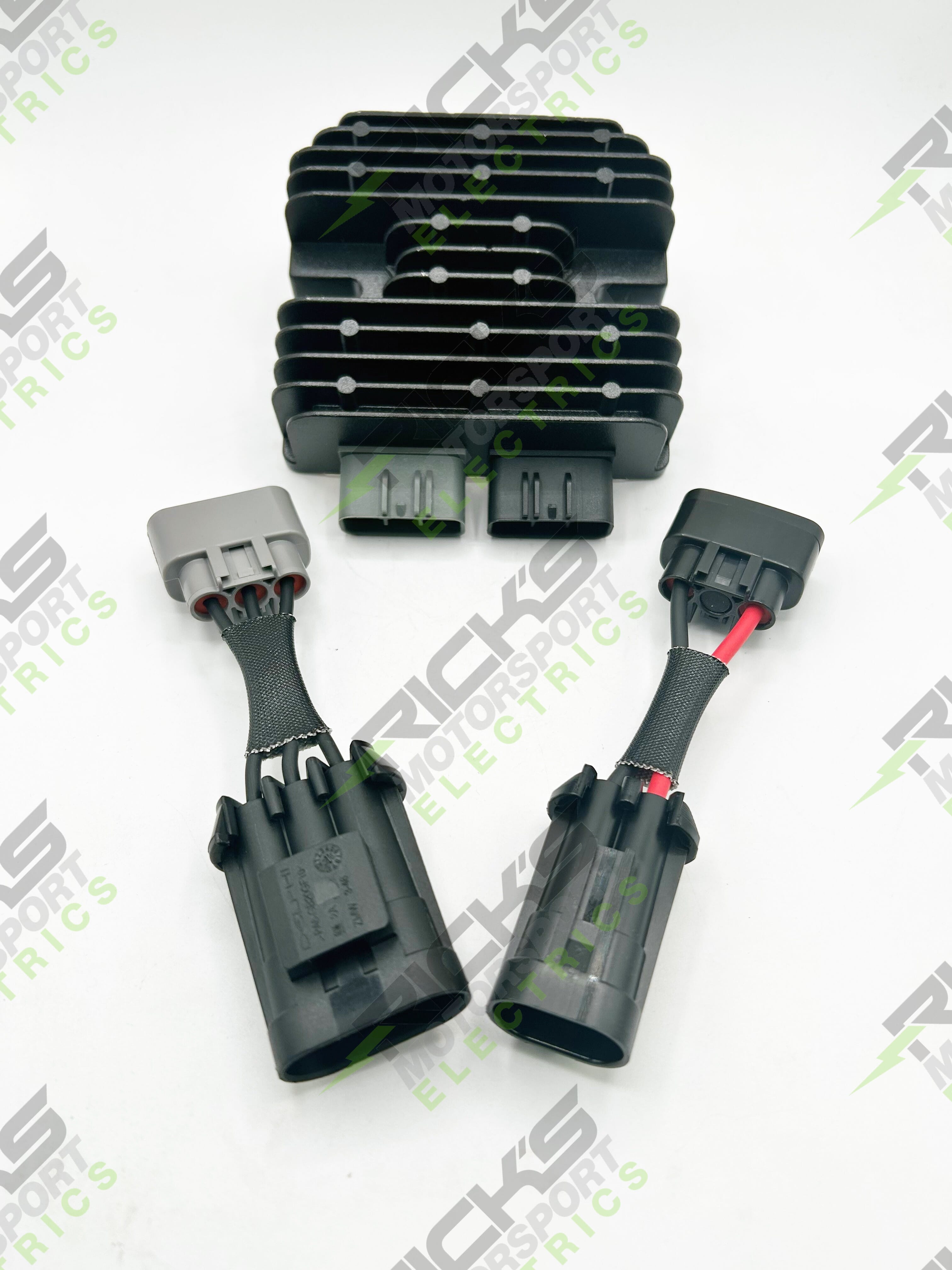 Aftermarket Hot Shot Rectifier-Regulator: This aftermarket rectifier regulator is an upgraded 70amp series/switching style unit vs the OEM 45amp piece. This unit is designed with adapter harnesses to be a plug & play piece for OEM # 74700042.