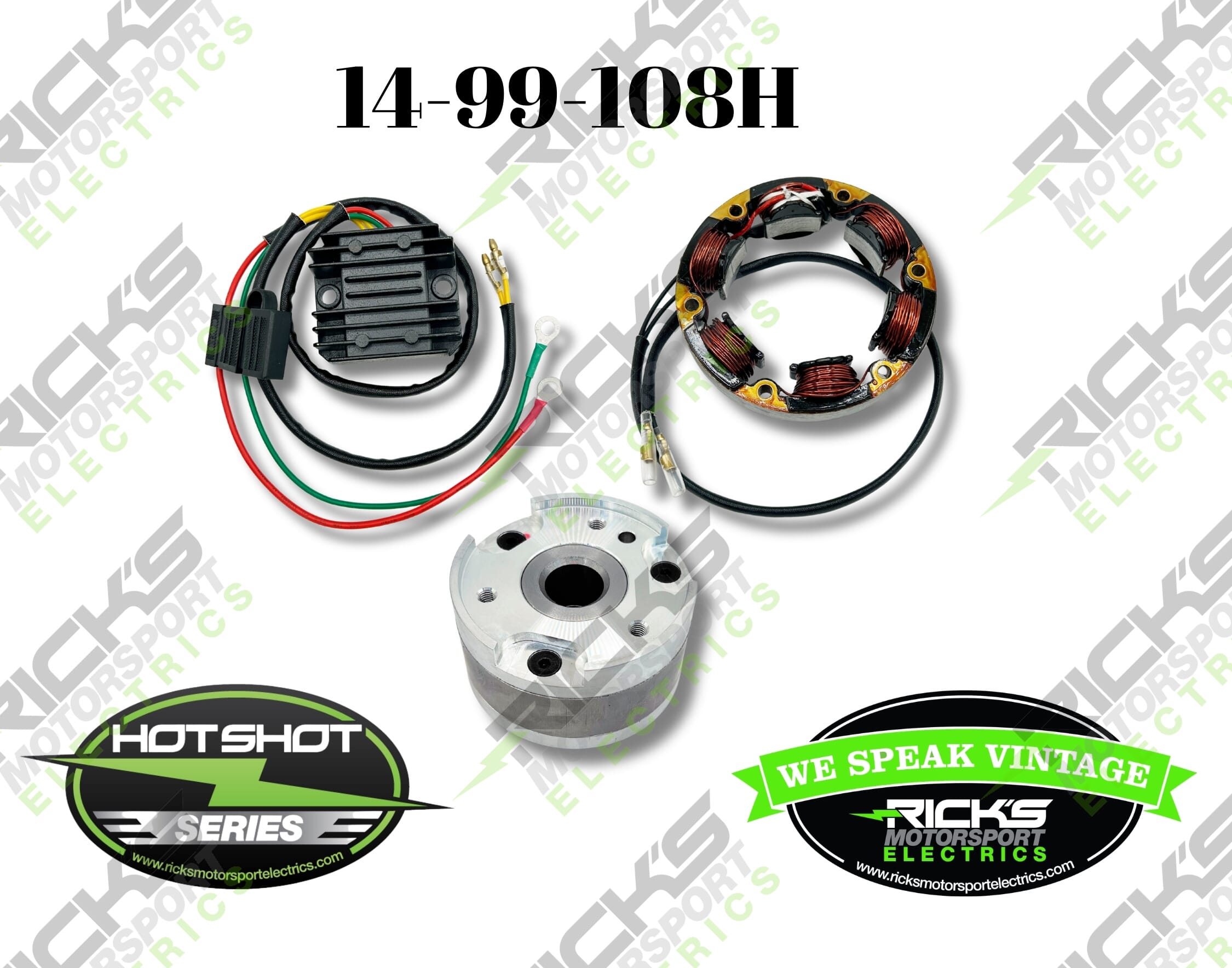 Complete Hot Shot Charging Kit: This is a complete charging kit for use with lithium batteries. It includes our rec/reg & stator from our charging kit# 14-99-101 as well as our new Hot Shot rotor part # 41-100H.