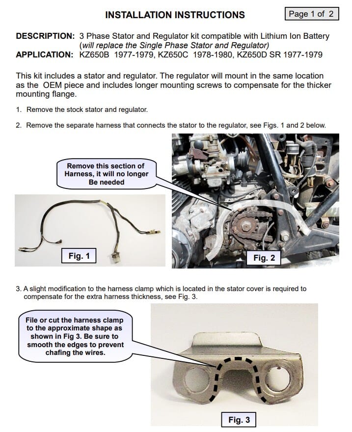 New Hot Shot Kawasaki Charging Kit for use with lithium batteries- this charging kit converts the system from a single phase permanent magnet to a 3 phase permanent magnet system: output power is increased by 20%. The kit comes with both a new stator & lithium compatible rectifier regulator and customers will reuse their OE flywheel. This kit fits 1978-80 KZ650s and replaces stator OE# 21003-1005. Installation instructions included. *This kit is made for lithium batteries only, NOT for use with standard lead acid batteries*
