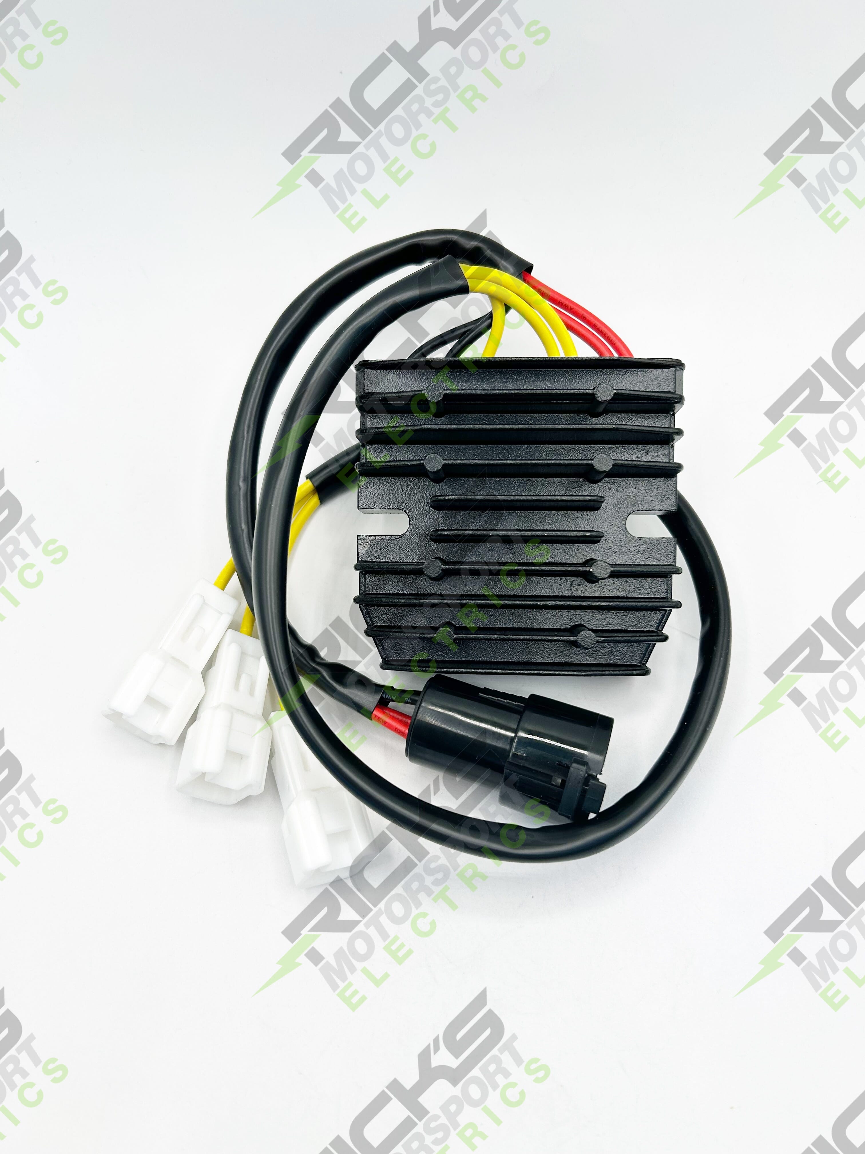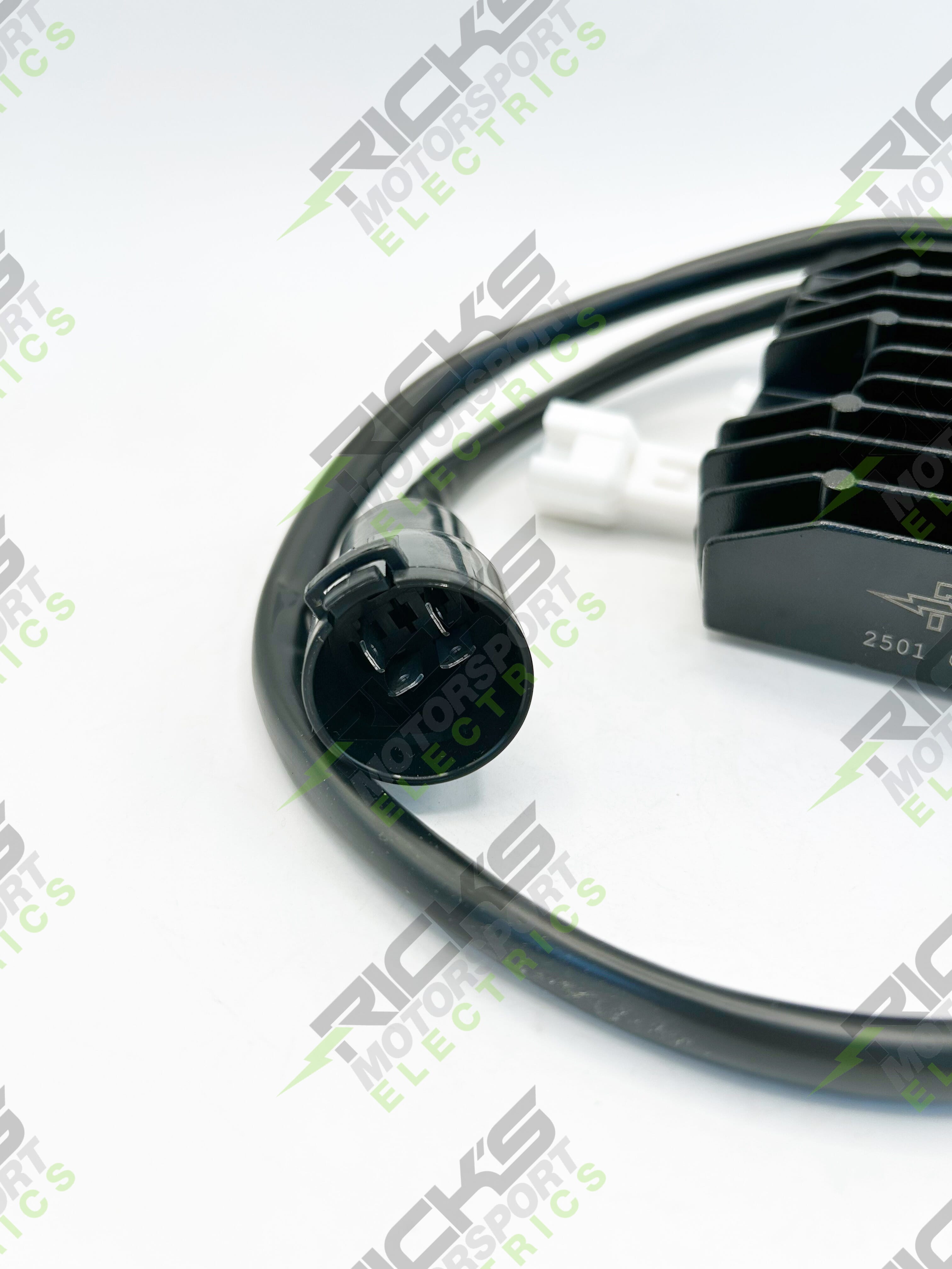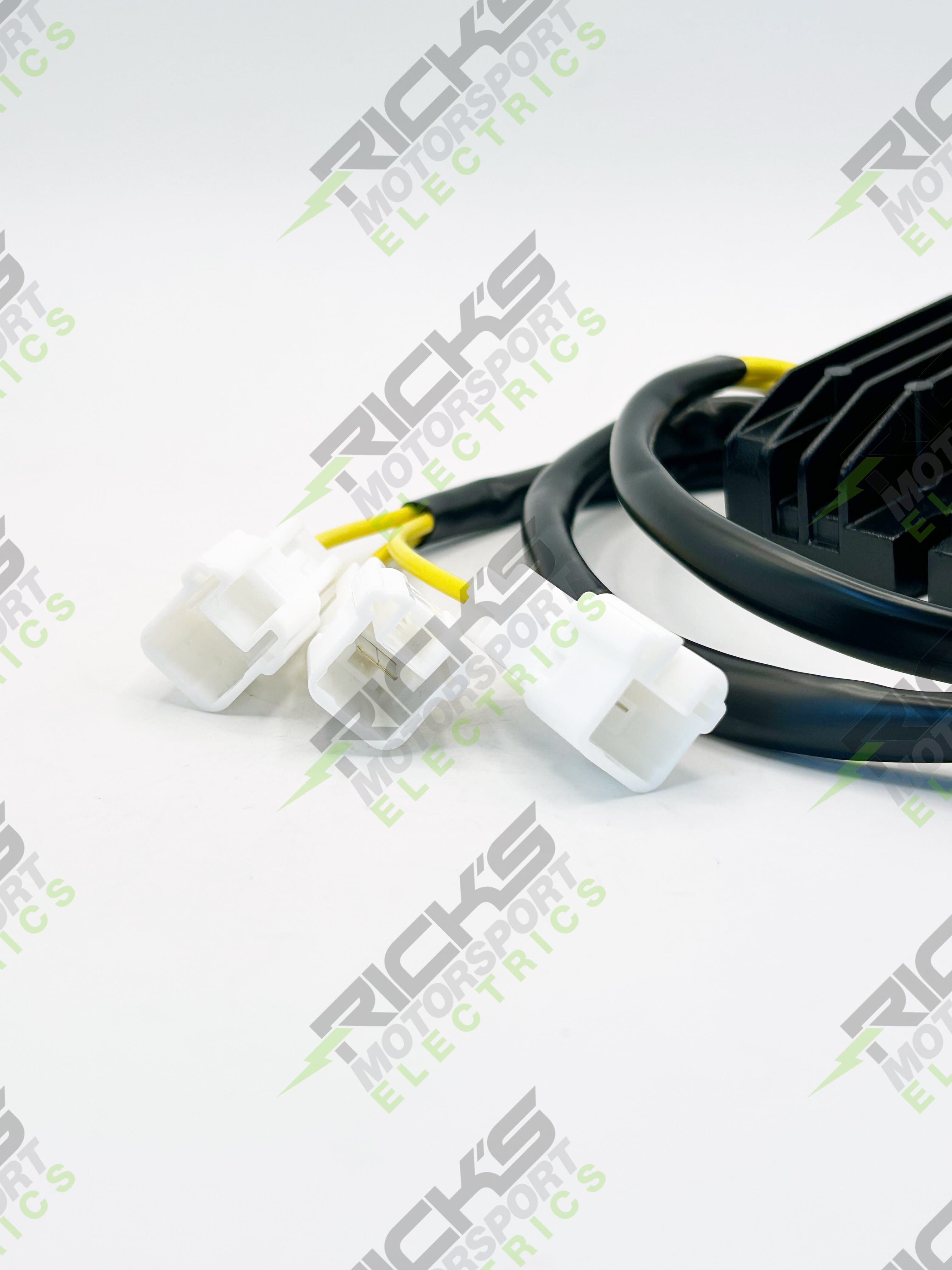 Rick's Motorsport Electrics offers their Hot Shot Aftermarket Lithium Ion Compatible Rectifier Regulator for 2004-05 ZX1200 Ninja ZX12R that replaces OE# 21066-0007. Rick's part #14-327H is a 50amp replacement for the OEM piece that is made with the correct voltage set point to work with Lithium Ion batteries.