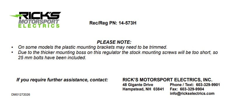 **This rec-reg is not for use with standard lead acid batteries. The voltage set point is 14V +/- .2. Please contact the manufacturer of your Lithium Ion Battery to ensure our product has the correct set point for their product. Rick's Motorsport Electrics One Year Product Warranty is for the Rec-Reg only. Rick's warranty does not cover batteries of any type.
