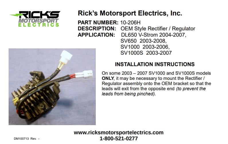Hot Shot Suzuki Rectifier-Regulator: This is an upgraded aftermarket replacement for OE# 32800-16G01 & 32800-16G00. This 50amp unit is designed with Mosfet technology which provides a cooler running rectifier-regulator. *Instructions included for 2003-2006 SV1000 and 2003-2007 SV1000S models.