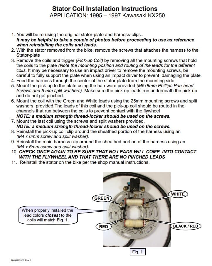 Kawasaki Stator Rebuild Kit: Rick's Motorsport Electrics aftermarket stator rebuild kit contains brand new coils that will mount onto the existing OE stator plate, new trigger coil, new grommet, & new connector. Customers will need to re-use the OE stator plate. Installation instructions are included. Rick's Motorsport Electrics can mount & install the rebuild kit for an additional charge if you send your OE stator to us. These components are part of the OE stator assembly # 21003-1293 or 21003-1281 and will fit 1995-97 KX250.