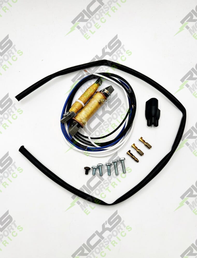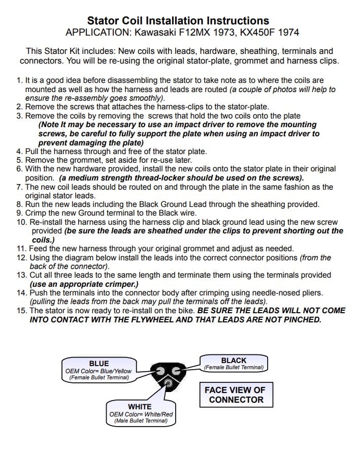 Kawasaki Stator Rebuild Kit: Rick's Motorsport Electrics aftermarket stator rebuild kit contains brand new charging coils that will mount onto the existing stator plate, new connector & terminals, sheathing, & new hardware. Customers will need to re-use the OE stator plate & grommet. Installation instructions are included. Rick's Motorsport Electrics can mount & install the rebuild kit for an additional charge if you send your OE stator to us. These components will fit vintage Kawasaki 450 dirt bikes are part of the OE stator assembly # 21003-019.