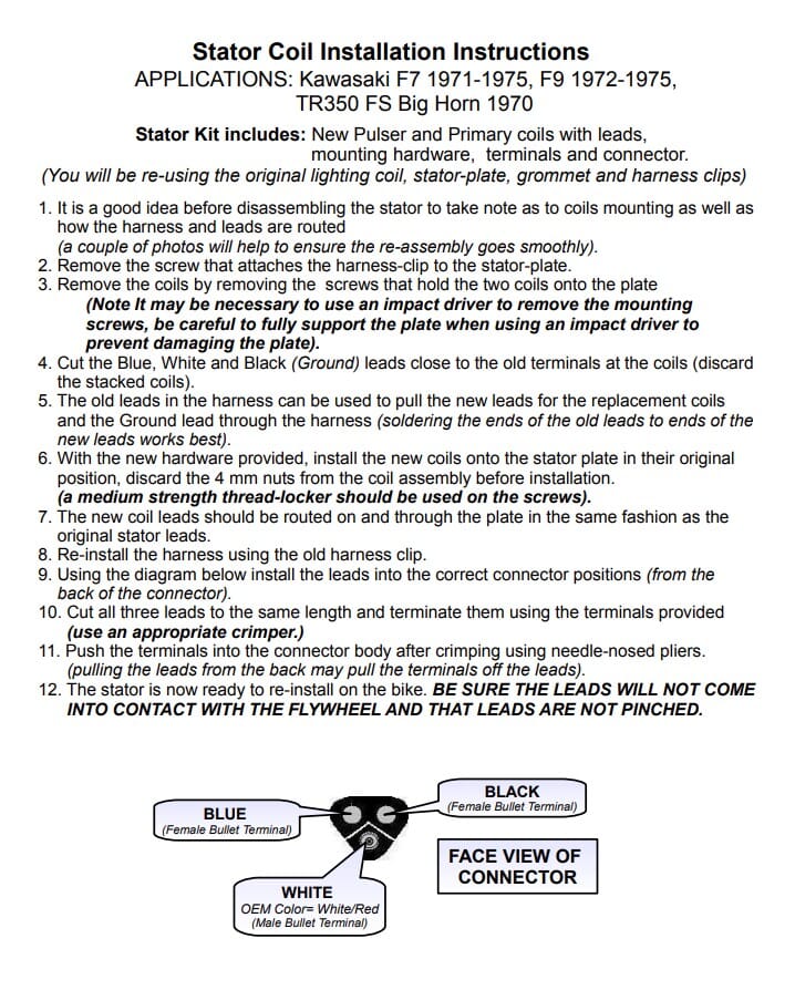 Kawasaki Stator Rebuild Kit: Rick's Motorsport Electrics aftermarket stator rebuild kit contains brand new pulsar & primary coils that will mount onto the existing stator plate, new connector & terminals, sheathing, & new hardware. this kit does NOT INCLUDE THE LIGHTING COIL. Customers will need to re-use the OE stator plate & grommet. Installation instructions are included. Rick's Motorsport Electrics can mount & install the rebuild kit for an additional charge if you send your OE stator to us. These components will fit vintage Kawasaki dirt bikes 1970-1975 F5, F7, & F9 are part of the OE stator assembly # 21003-011. Be sure to check your specific year/make/model to ensure proper fitment before ordering.