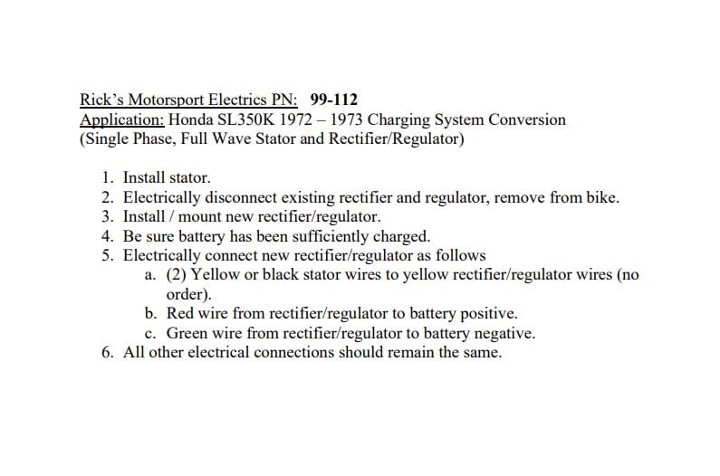 New Honda Charging Kit: This kit is a Rick's Motorsport Electrics original design; it includes both a stator and a rectifier-regulator. The kit will put out approximately 150 watts and power a 55 watt headlight if the customers rotor has not been compromised. To optimize output - upgrade rotor to our part# 41-100H *Lithium Ion battery users: please see our part# 14-99-112 designed specifically for use with lith-ion batteries.