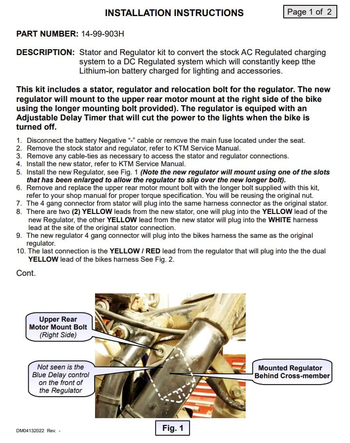 New Hot Shot KTM Charging Kit, this aftermarket kit from Rick's Motorsport Electrics includes both a new 8 pole stator & new rectifier/regulator and will work with lithium batteries. The kit will convert the system from an AC to DC so that all of the charging system will go to the lights. Rick's kit has an output of 80 watts and comes with a one year replacement warranty. This kit will replace KTM stator OE# 55139004100 and 55139004000. ** This kit is for the "W" models ONLY - these bikes have different rear suspension. We provide the longer bolt on the W models so that the customer can use it to mount the regulator. The customer needs to remove the upper rear motor mount bolt and replace it with our longer bolt . This way the customer can mount the regulator using that bolt/location. Installation instructions are included.