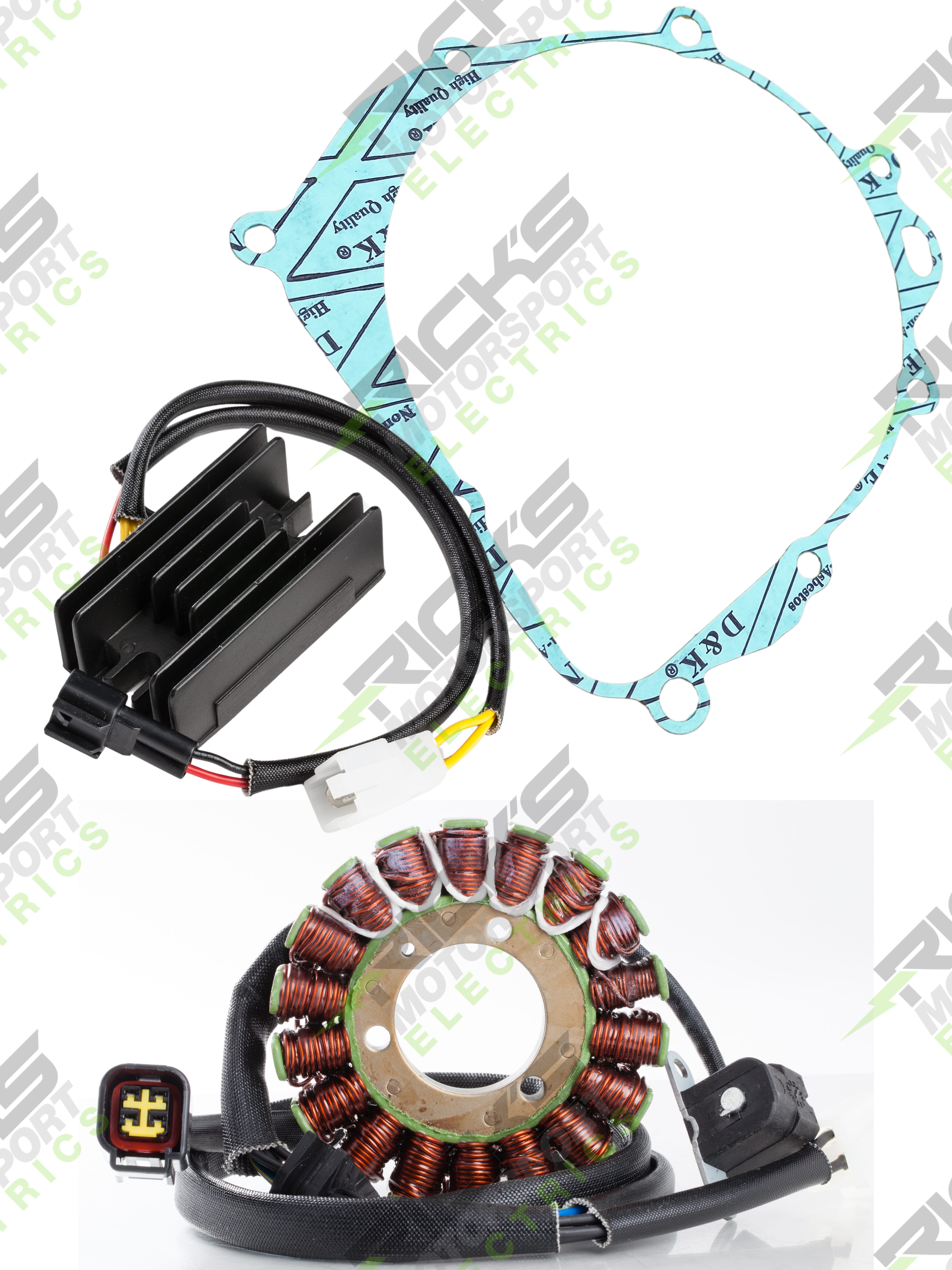 New Hot Shot Style Rick's Easy Kit; This complete charging kit is designed to make the repair job as easy as possible. Kit includes a new Hot Shot stator, new rec/reg & new stator gasket. Our aftermarket parts will replace OE# 32101-29F00(stator); 32800-29F00(rec/reg); 11483-29F00(gasket).