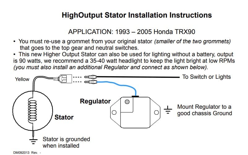 New Hot Shot Honda Stator: Rick's aftermarket stator will fit 1993-02 TRX90 and replace OE#: 31120-HF7-003. This higher output stator will provide 90 watts of power.*It requires Rick's regulator part# 10-443 to use the additional wattage. Detailed installation instructions will be provided for both parts. *This stator does not include the small secondary grommet.