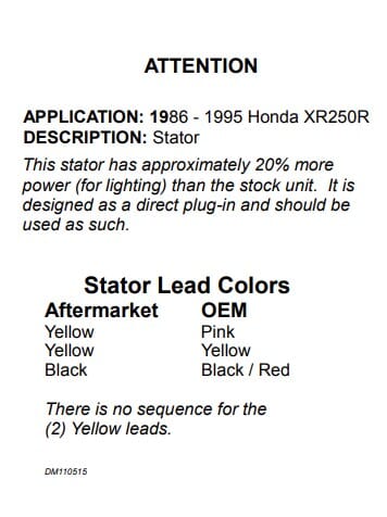 New Hot Shot Honda Stator: This high output stator will provide approximately 105 watts of power - 40% over the stock system. This will fit 1986-95 XR250R and replace OE part # 31120-KT1-00.