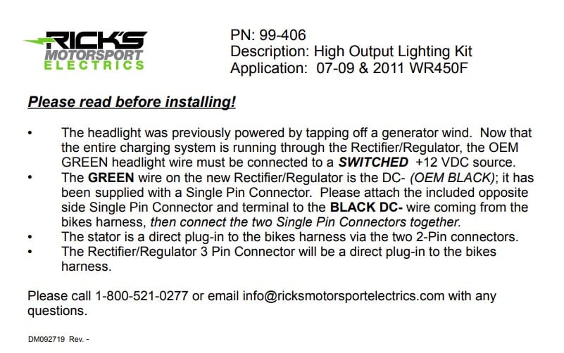 New Hot Shot Yamaha Charging Kit: This Hot Shot Charging Kit is a Rick's Motorsport Electrics original design. It includes both a high output stator and regulator. Installation instructions will be provided. This kit will fit 07-09 & 2011 Yamaha WR450F and offer an upgraded output of 140 watts.