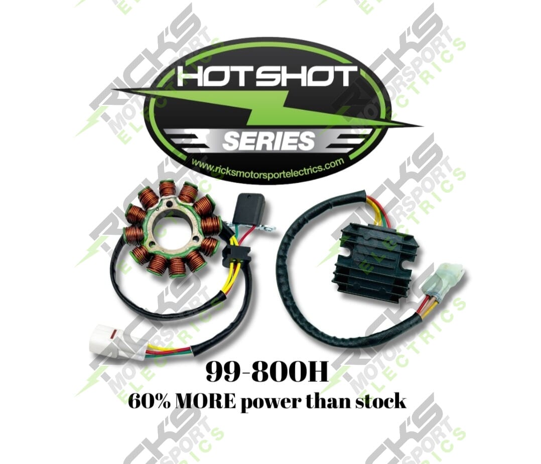 New Hot Shot Suzuki Charging Kit: This kit includes a high output stator, complete with OE style grommet, connector, & trigger/pick-up coil + a new rec/reg designed to work with this system. The kit replaces stator OE#32101-28HA0 and provides an additional 60% increase in electrical power over the OE system.