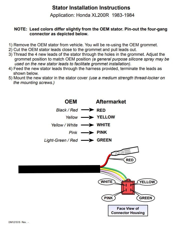 New OEM Style Honda Stator: This aftermarket stator is for 1983-1984 XL200R with OEM #s 31120-KG1-005 & 31120-KG1-004 . **The grommet is not included with this stator; Connectors & terminals will be provided separately with installation instructions.