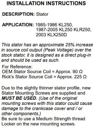 New OEM Style Kawasaki Stator; this aftermarket stator will fit 1985-1986 KL250, 1987-2005 KLR250, and 2003 KLX250D. It will replace Kawasaki OE# 21003-1121. The Rick's stator will be slightly thinner than OE but the ignition output is actually increased vs. the stock system (approx 25% increase). Smaller bolts will be included & needed for proper installation.