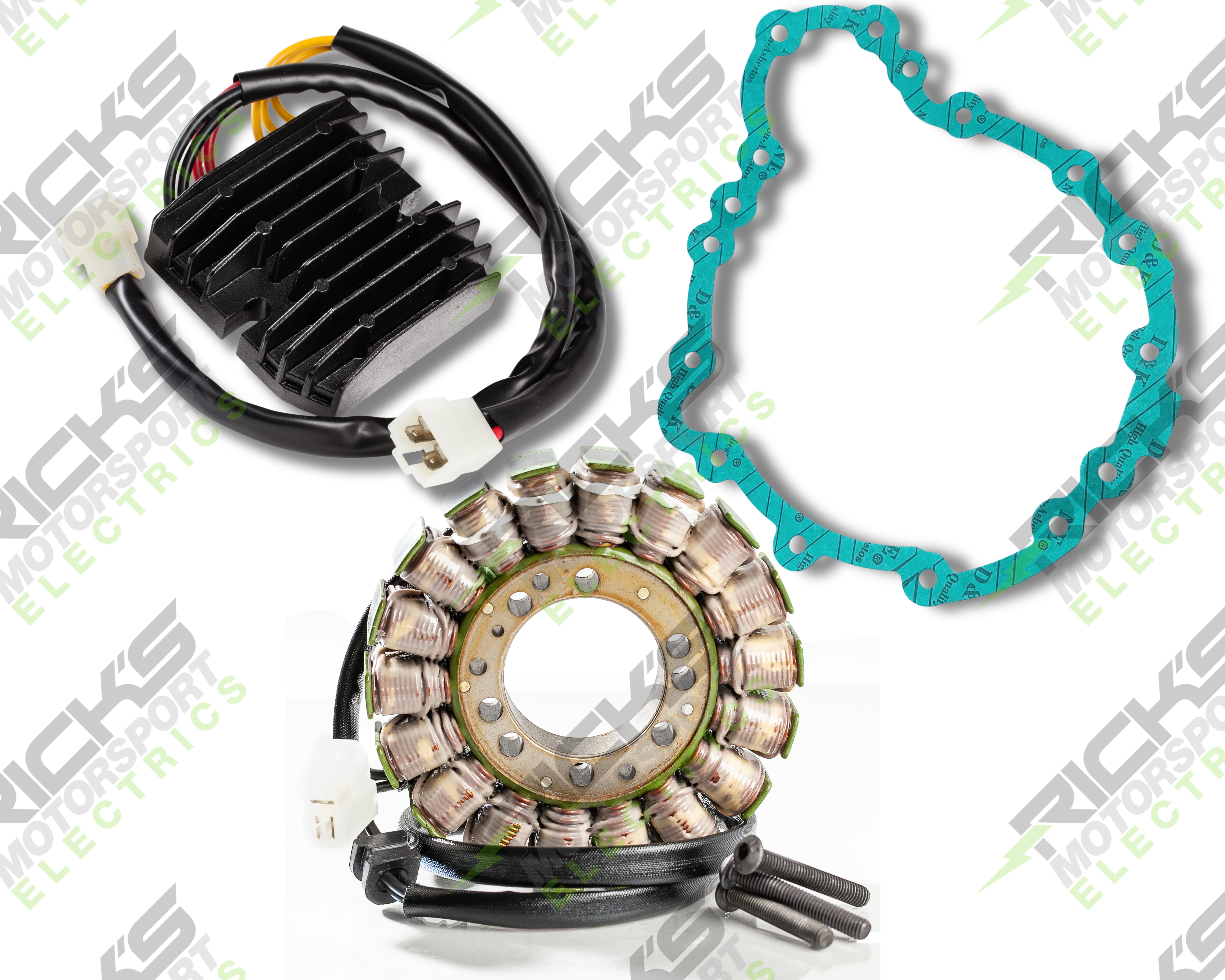 New OEM Style Rick's Easy Kit; This complete charging kit is designed to make the repair job as easy as possible. Kit includes a new stator, new Hot Shot rec/reg & new stator cover gasket. Our aftermarket parts will replace OE# T1300509, T1300111 (Stator); T1300560 (rec/reg) & T1261098 (gasket). **Special low-profile mounting screws are provided for the stator and must be used at installation.