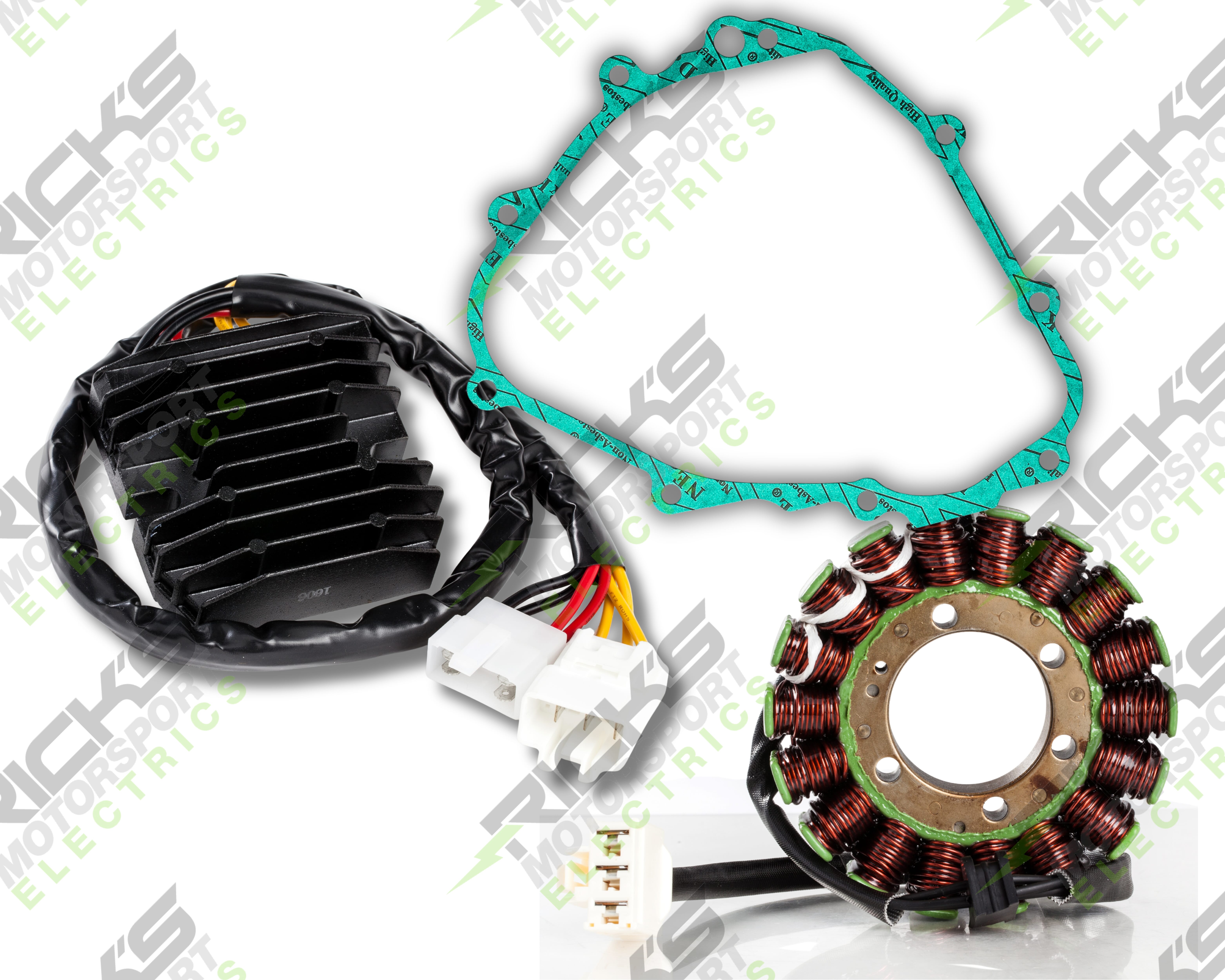 New OEM Style Rick's Easy Kit; This complete charging kit is designed to make the repair job as easy as possibly. Kit includes a new stator, new 50amp MOSFET rec/reg & new stator gasket. Our aftermarket parts will replace OEM # 31120-MBW-J21 (stator), 31600-MBW-D21, 31600-MBW-G90 (rec/reg),11392-MBW-000 (gasket).