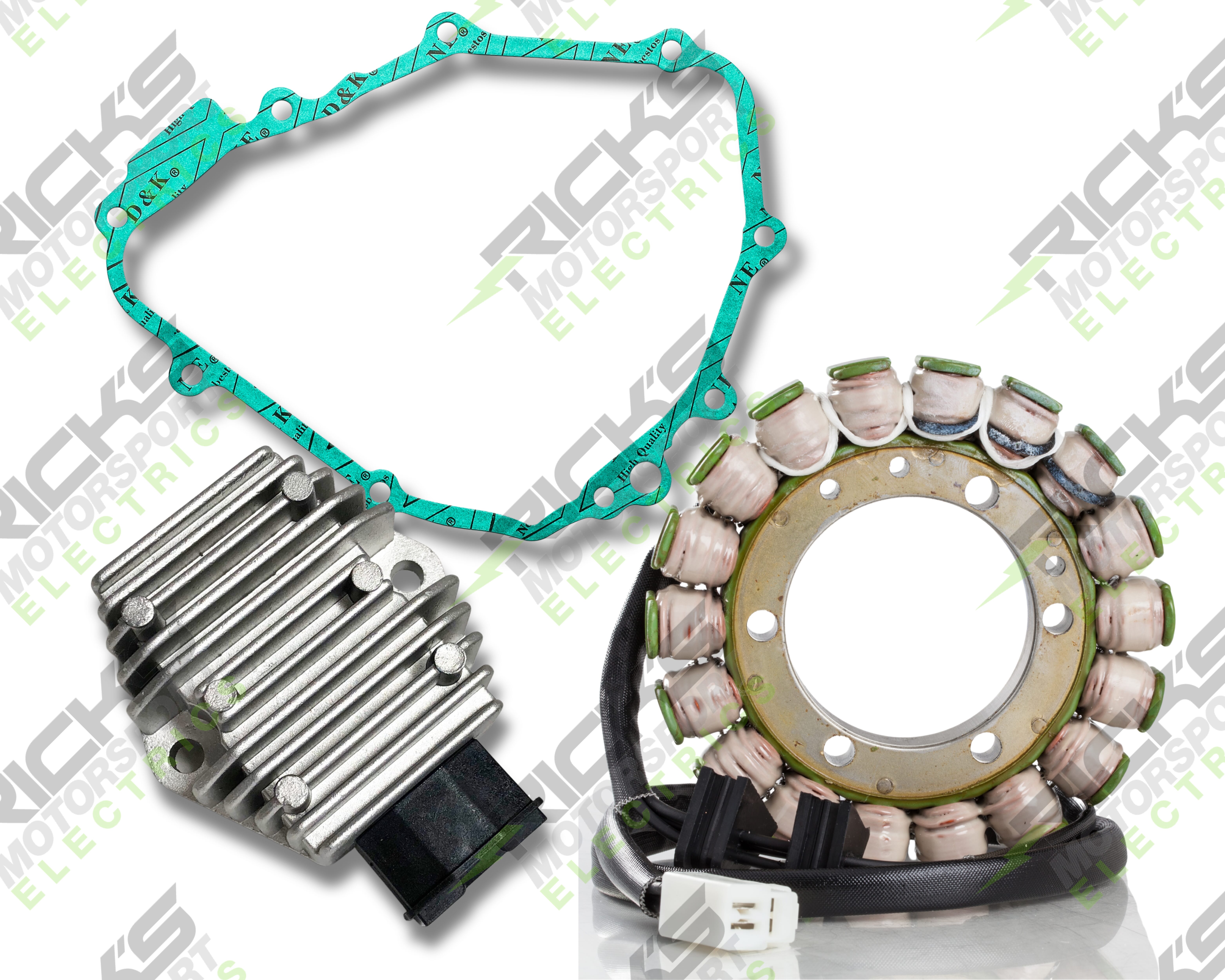 New OEM Style Rick's Easy Kit; This complete charging kit is designed to make the repair job as easy as possibly. Kit includes a new stator, new 35amp MOSFET rec/reg & new stator cover gasket. Our aftermarket parts will replace OEM # 31120-MAS-004 (stator); 31600-MV4-010 (rec/reg); 11392-MV9-670 (gasket).
