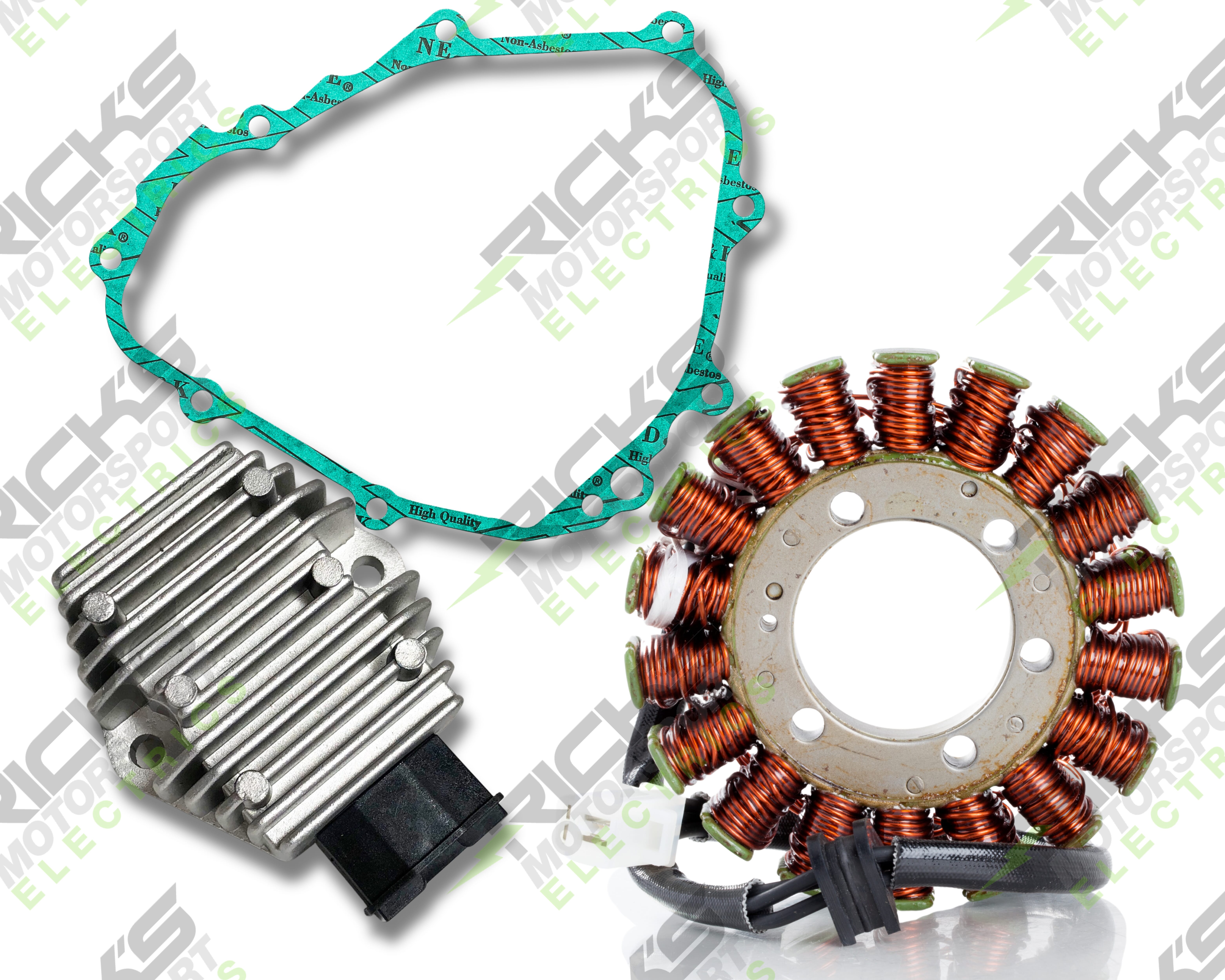 New OEM Style Rick's Easy Kit; This complete charging kit is designed to make the repair job as easy as possibly. Kit includes a new stator, new 35amp MOSFET rec/reg & new stator cover gasket. Our aftermarket parts will replace OE#: 31120-MBW-611 (stator); 31600-MV4-010 (rec/reg); 11392-MBW-000 (gasket).