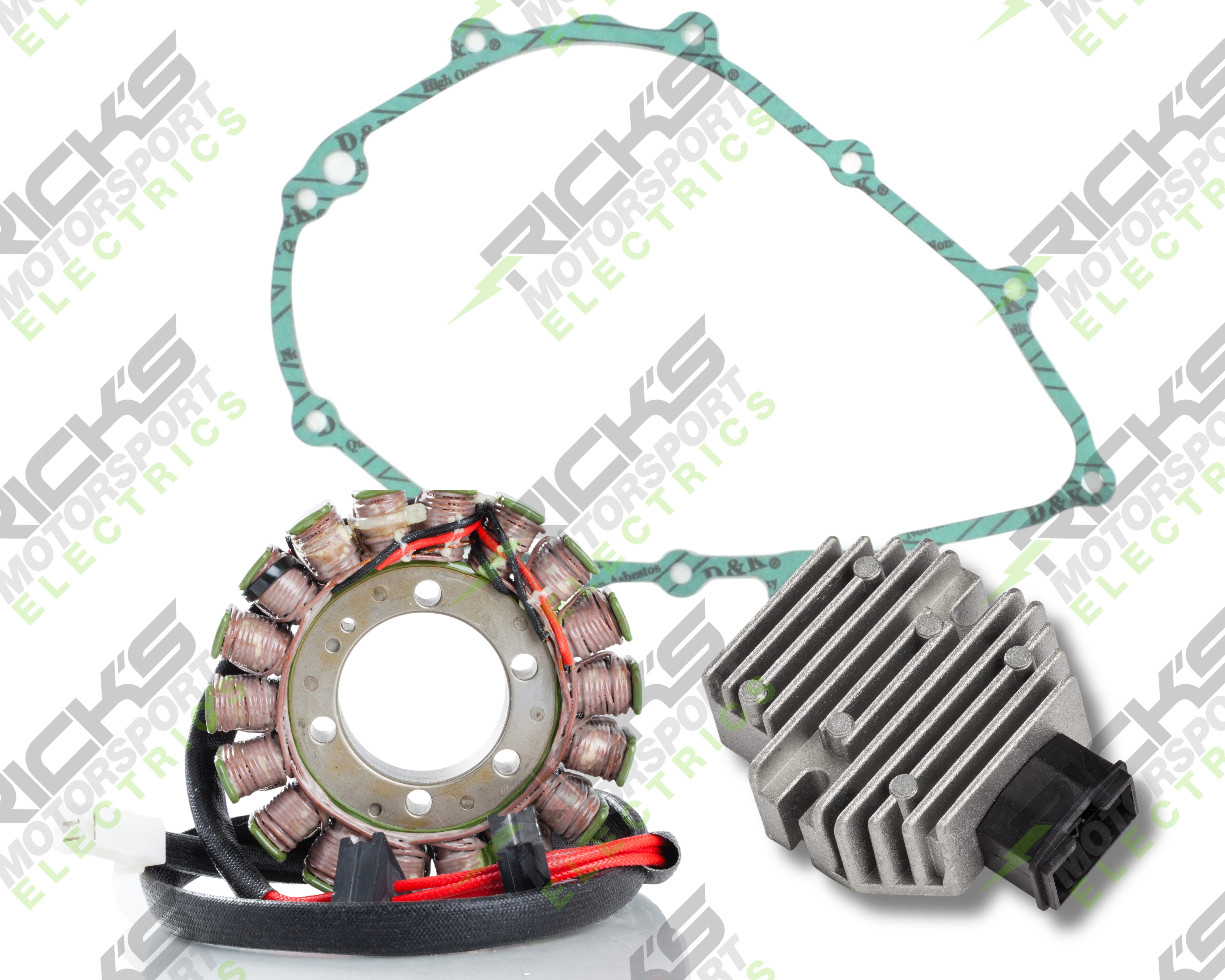 New OEM Style Rick's Easy Kit; This complete charging kit is designed to make the repair job as easy as possibly. Kit includes a new stator, new 35amp MOSFET rec/reg & new stator cover gasket. Our aftermarket parts will replace OE#: 31120-MAT-004 (stator); 31600-MY7-305 (rec/reg); 11392-MAT-000 (gasket).