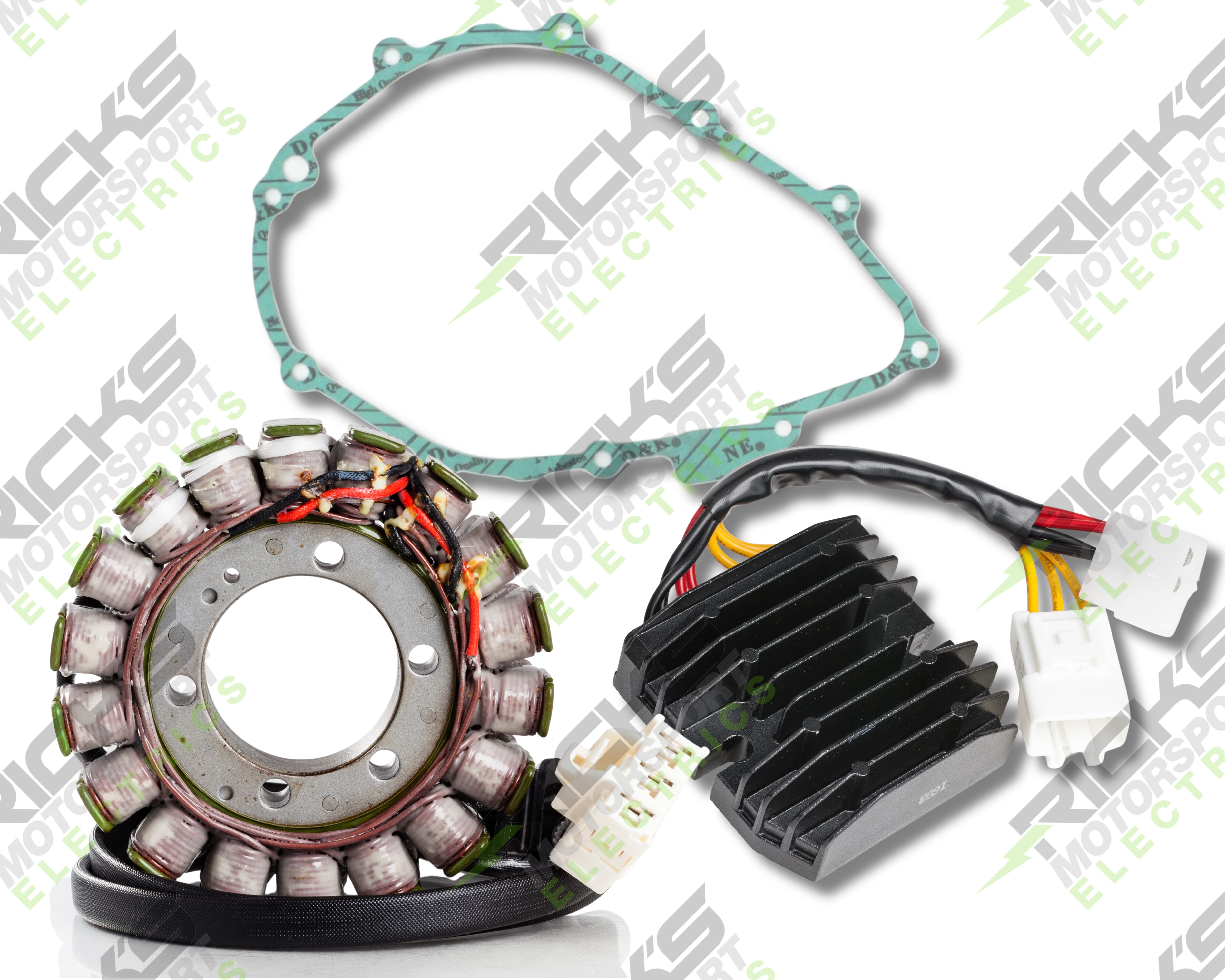 New OEM Style Rick's Easy Kit; This complete charging kit is designed to make the repair job as easy as possibly. Kit includes a new stator, new 50amp MOSFET rec/reg & new stator cover gasket. Our aftermarket parts will replace OE#: 31120-MAT-E01 (stator); 31600-MAT-E01 (rec/reg); 11392-MAT-000 (gasket).