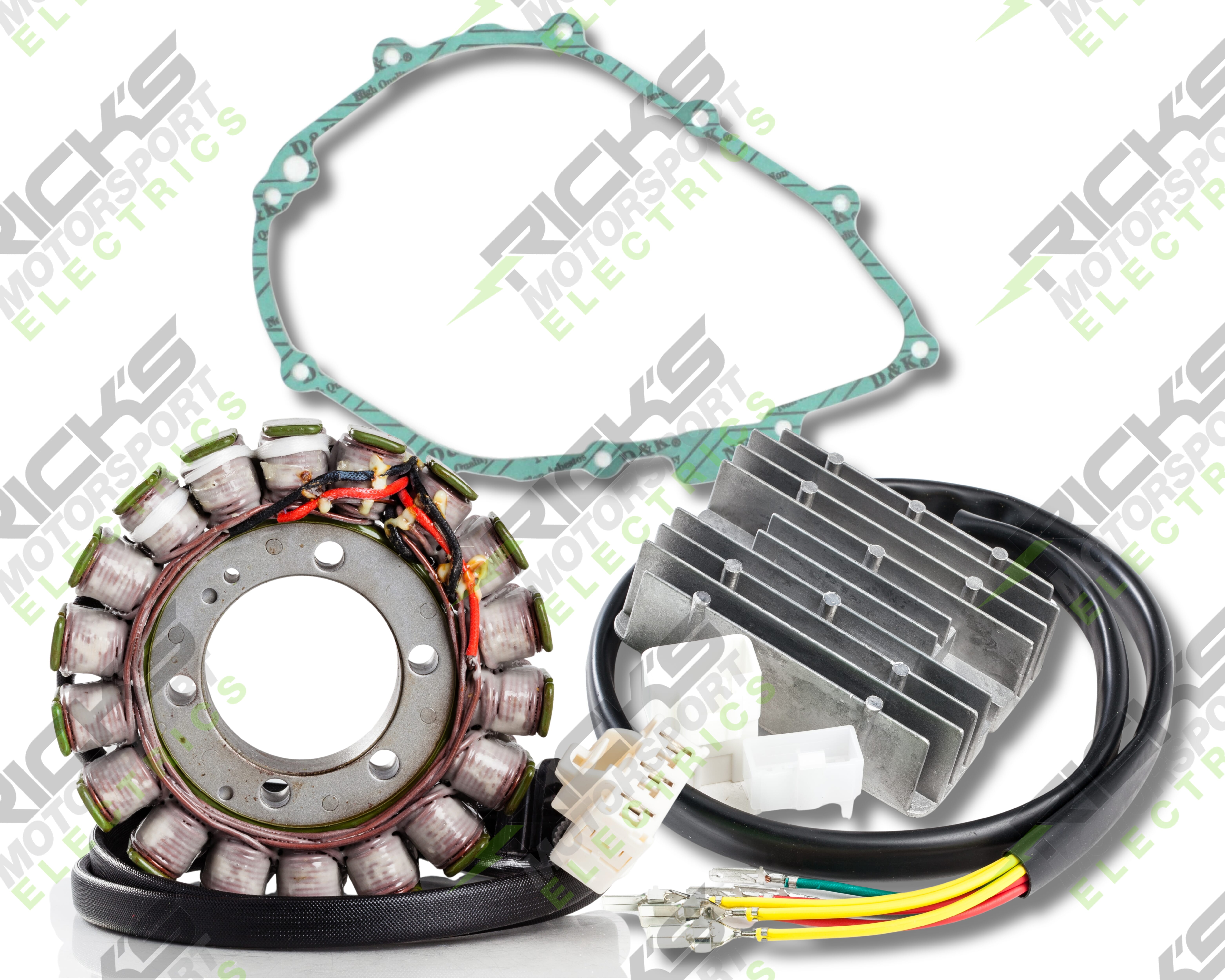 New OEM Style Rick's Easy Kit; This complete charging kit is designed to make the repair job as easy as possibly. Kit includes a new stator, new rec/reg & new stator cover gasket. Our aftermarket parts will replace OE#: 31120-MAT-E01 (stator); 31600-MAT-D51, 31600-MAT-D50 (rec/reg); 11392-MAT-000 (gasket).