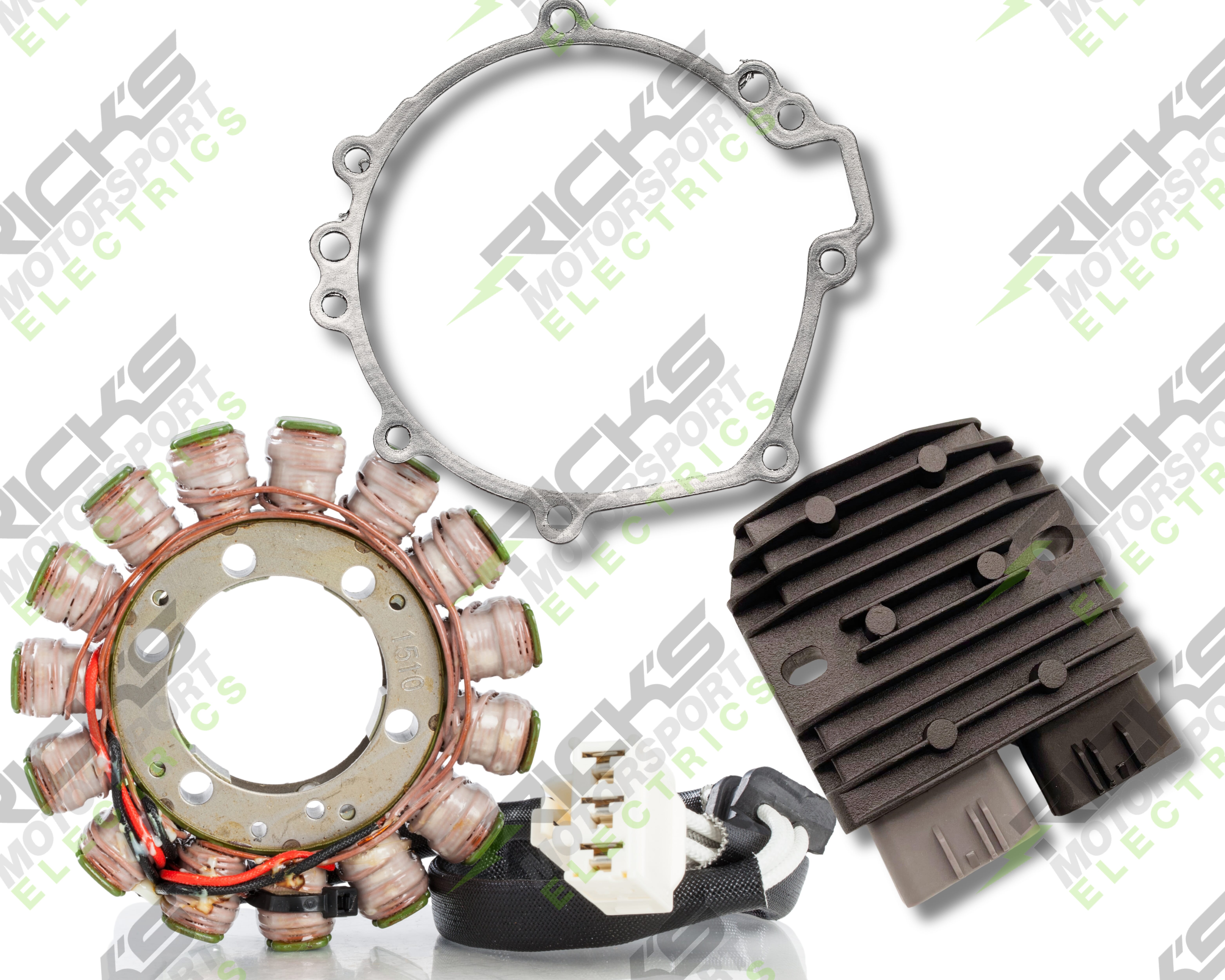New OEM Style Rick's Easy Kit; This complete charging kit is designed to make the repair job as easy as possible. Kit includes a new stator, new rec/reg & new stator gasket. Our aftermarket parts will replace OE#: 21003-0167(stator), 21066-0771(rec/reg), 11061-1119(gasket).