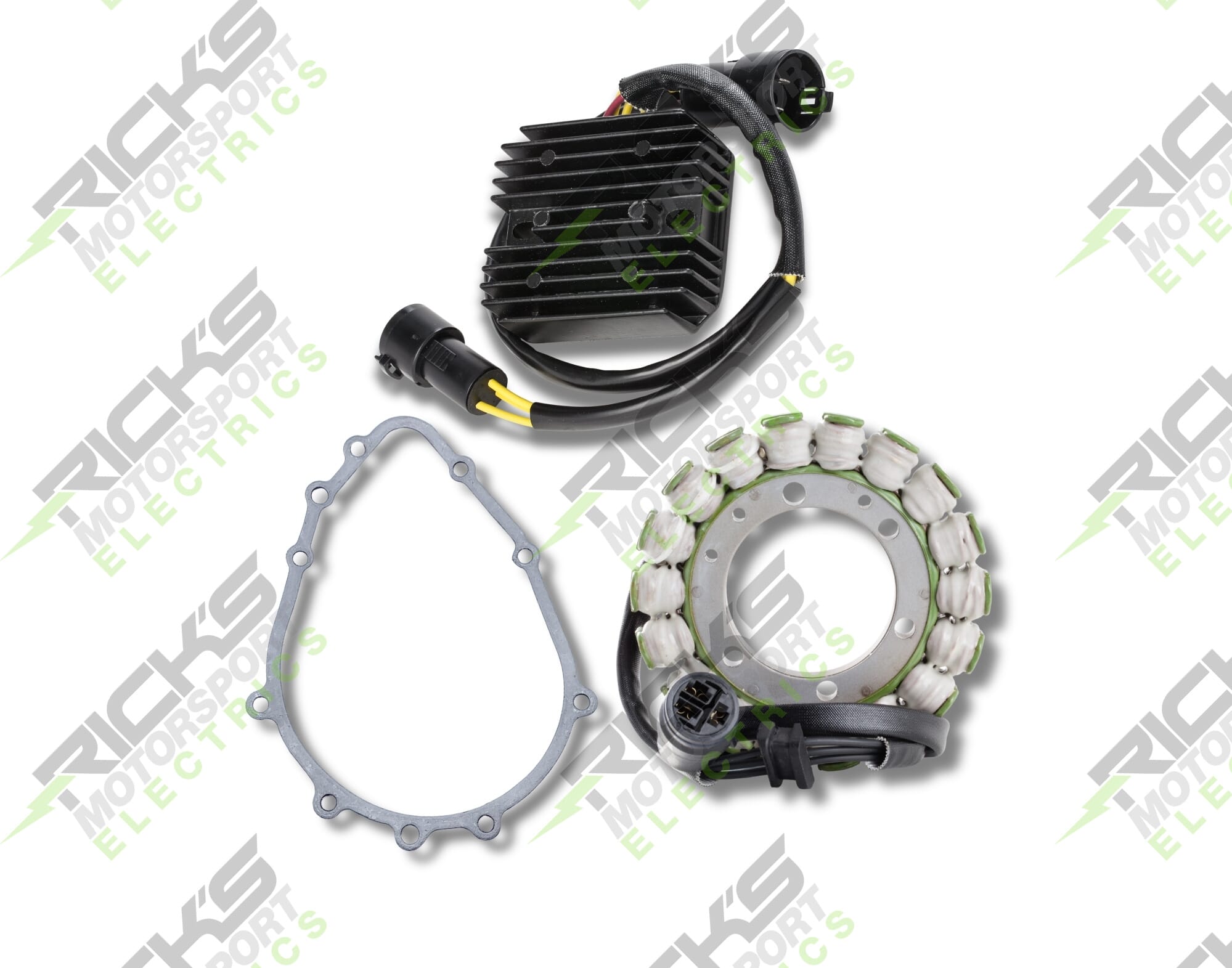 New OEM Style Rick's Easy Kit; This complete charging kit is designed to make the repair job as easy as possible. Kit includes a new stator, new rec/reg & new stator gasket. Our aftermarket parts will replace OE #: 21003-1358 (stator), 21066-1125 (rec/reg); 11060-1851(replacement), 11060-1673 (gasket).
