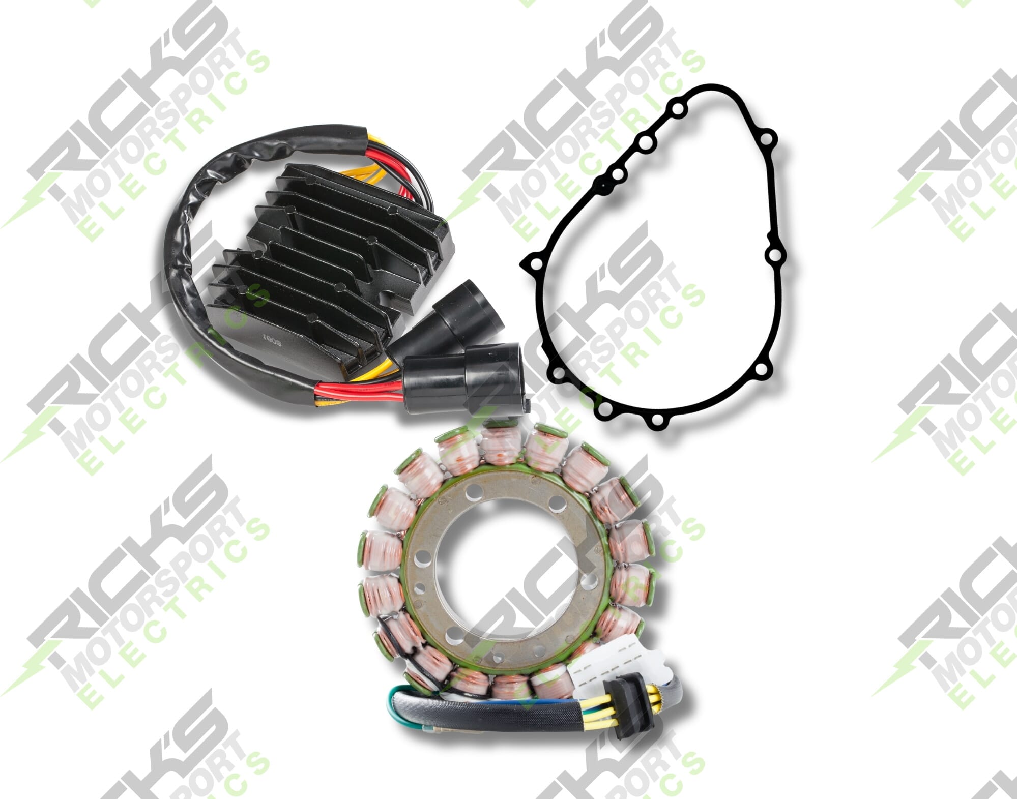 New OEM Style Rick's Easy Kit; This complete charging kit is designed to make the repair job as easy as possible. Kit includes a new stator, new 50amp MOSFET rec/reg & new stator gasket. Our aftermarket parts will replace OE #: 21003-1320; 21003-1397, 21003-1353 (stator); 21066-1119 (rec/reg); 11060-1854 (gasket).