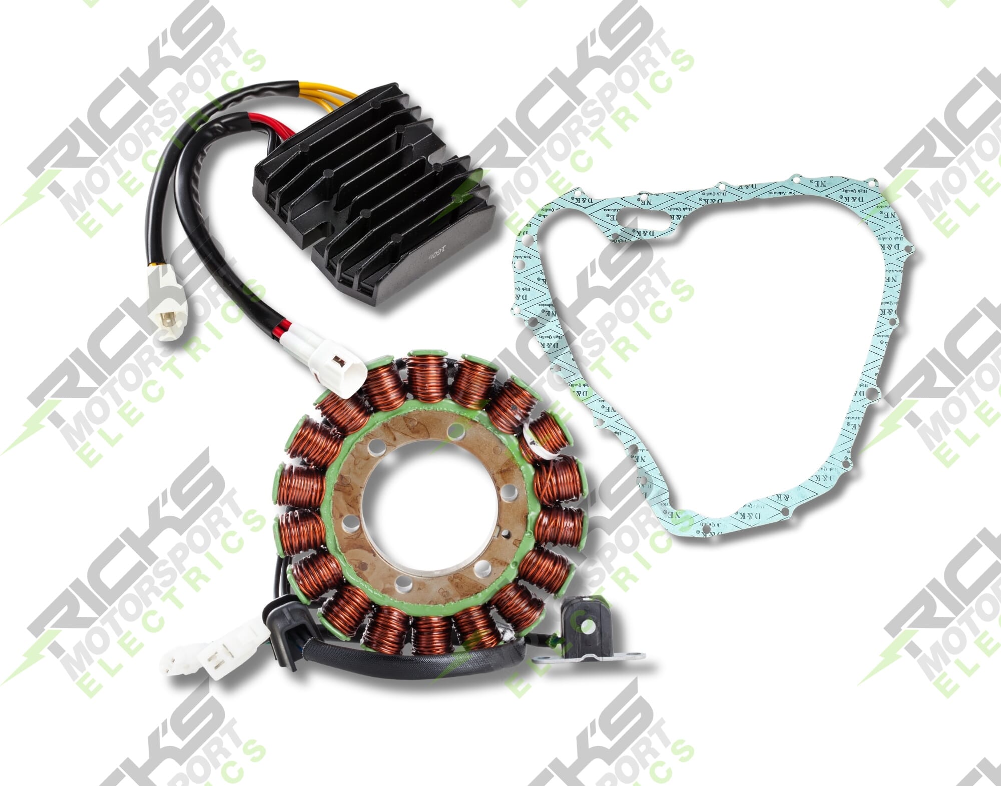 New OEM Style Rick's Easy Kit; This complete charging kit is designed to make the repair job as easy as possible. Kit includes a new stator, new 50 amp MOSFET rec/reg & new stator cover gasket. Our aftermarket parts will replace OE#: 32101-31G00 (stator); 32800-41F10 (rec/reg); 11483-31G00 (gasket).