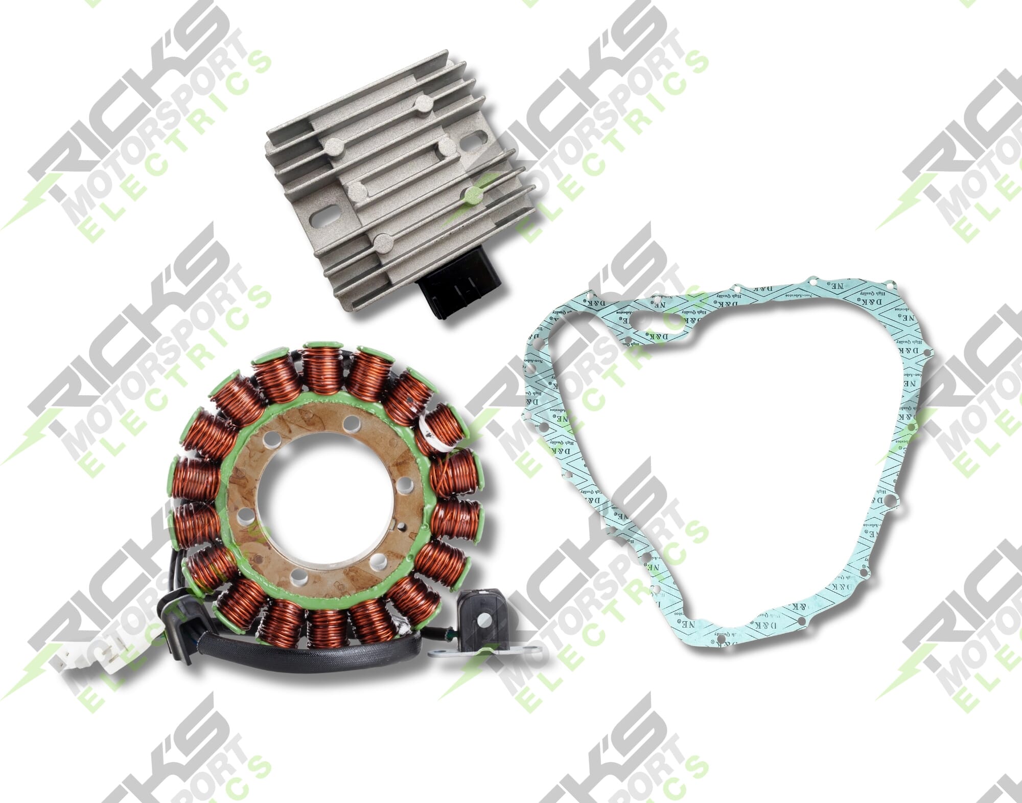 New OEM Style Rick's Easy Kit; This complete charging kit is designed to make the repair job as easy as possible. Kit includes a new stator, new 35 amp MOSFET rec/reg & new stator cover gasket. Our aftermarket parts will replace OE#: 32101-31G00 (stator); 32800-42F00, 32800-42F10 (rec/reg); 11483-31G00 (gasket).