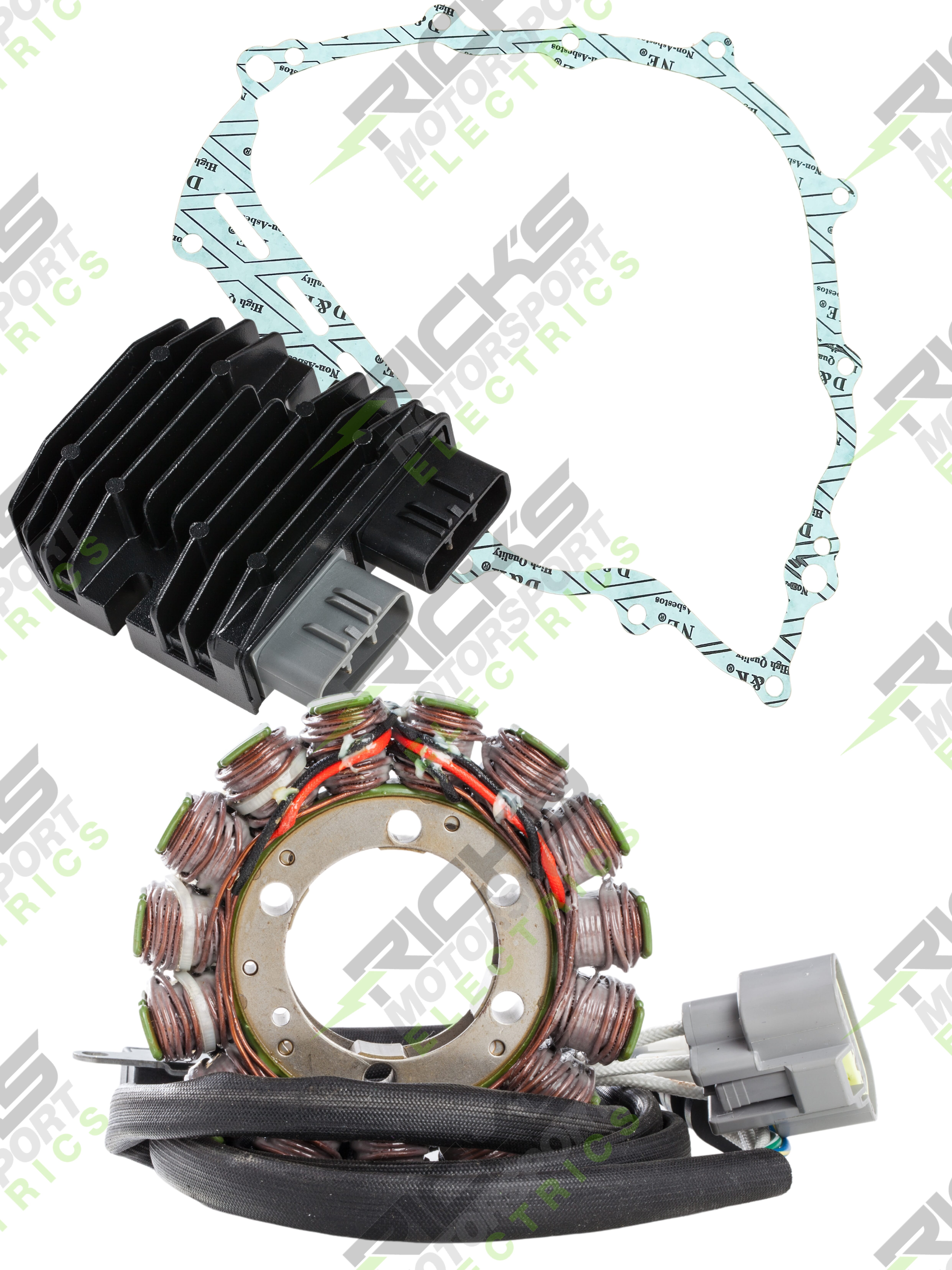 New OEM Style Rick's Easy Kit; This complete charging kit is designed to make the repair job as easy as possible. Kit includes a new stator, new rec/reg & new stator gasket. Our aftermarket parts will replace OE# 28P-81410-01-00, 28P-81410-00-00, & 3B4-81410-00-00 (stator); 3B4-15451-00-00(gasket); 1D7-81960-01-00 & 1D7-81960-00-00(rec/reg).