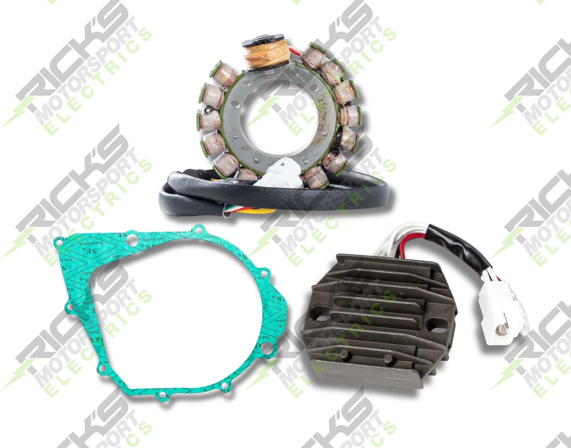 New OEM Style Rick's Easy Kit: This complete charging kit is designed to make the repair job as easy as possible. Kit includes a new stator, new rec/reg & new stator cover gasket. Our aftermarket parts will replace OEM #s 3HN-85510-10-00 (stator); 4KB-81960-02-00, 4KB-81960-01-00 (rec/reg); 3GD-15451-00-00, 1UY-15461-00-00 (gasket).