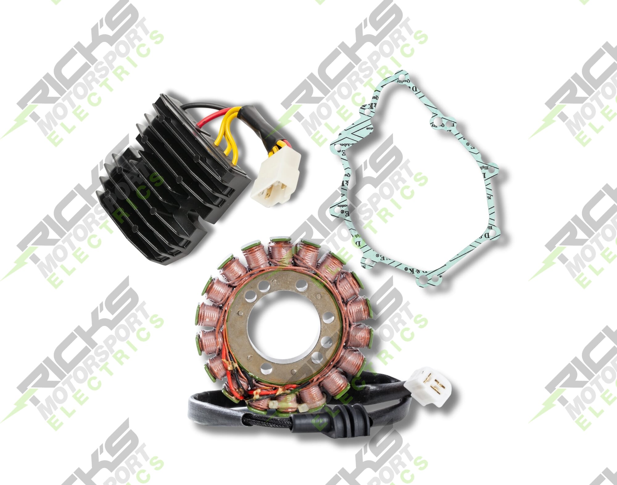 New OEM Style Rick's Easy Kit: This complete charging kit is designed to make the repair job as easy as possible. Kit includes a new stator, new 50 amp MOSFET rec/reg & new stator cover gasket. Our aftermarket parts will replace OEM #s 5EB-81410-00-00 (stator) ; 4JH-81960-01-00 (rec/reg); 5EB-15451-00-00 (gasket).