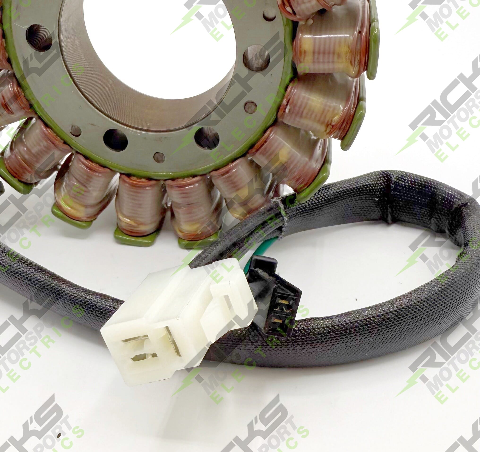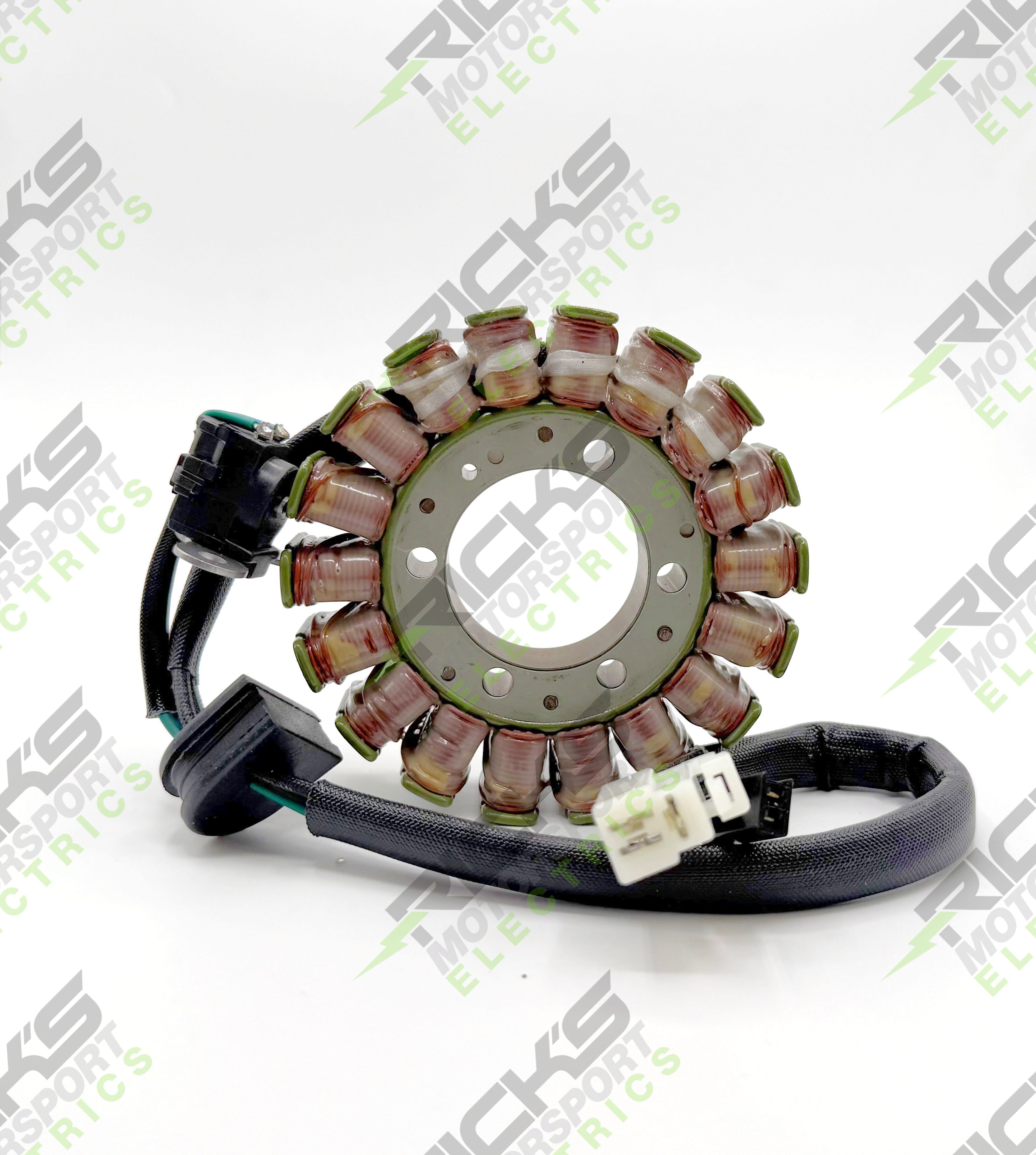 New OEM Style Suzuki Stator, Rick's aftermarket stator will replace OE#: 32101-24F22 and 32101-24F21. This part come complete with OEM style connectors, grommet, and trigger coil and fits 2018-2024 GSXR1300R Hayabusa.