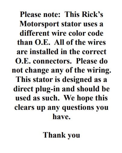 New OEM Style Suzuki Stator: This Rick's Motorsport stator is for DR650S/SE models with OEM # 32101-12D00 & uses a different wire color code than O.E. All of the wires are installed in the correct O.E. connectors. Customers should not change any of the wiring. This stator is designed as a direct plug-in and should be used as such.