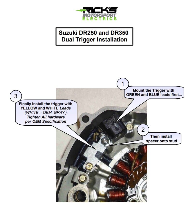 This is a brand new Rick's Motorsport Electrics Aftermarket Stator that fits Suzuki DR250SE & DR350SE Dual Sport models with OE# 32101-15D01 or 32101-15D00. Rick's part #21-827 is a direct replacement that is designed to OEM specifications. This stator assembly comes complete with Trigger Coils, Grommet & Connector for easy installation!