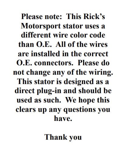 New OEM Style Yamaha Stator: This Rick's Motorsport stator uses a different wire color code than O.E. All of the wires are installed in the correct O.E. connectors. Customers should not change any of the wiring. This stator is designed as a direct plug-in and should be used as such.