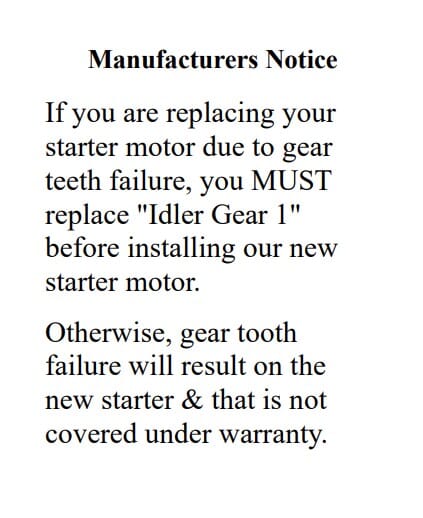 New Yamaha Starter Motor: *If the starter motor is being replaced due to gear teeth failure the IDLER GEAR 1 must be replaced before installing the new starter motor; otherwise gear tooth failure will result on the new starter motor which will not be covered under warranty.