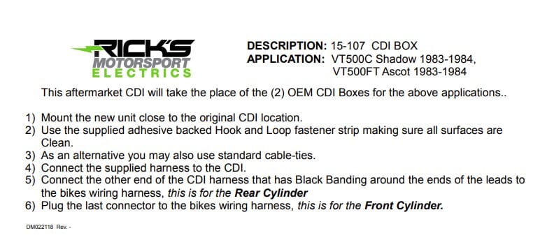 OEM Style Honda CDI Box: This part does not include the spark unit mount. *The Rick's part replaces both individual Honda boxes, you do NOT need to order 2 pieces. It is a replacement for OE#'s 30400-MF5-771 & 30400-MF5-004. *CDI Boxes are not covered under the One Year Warranty.