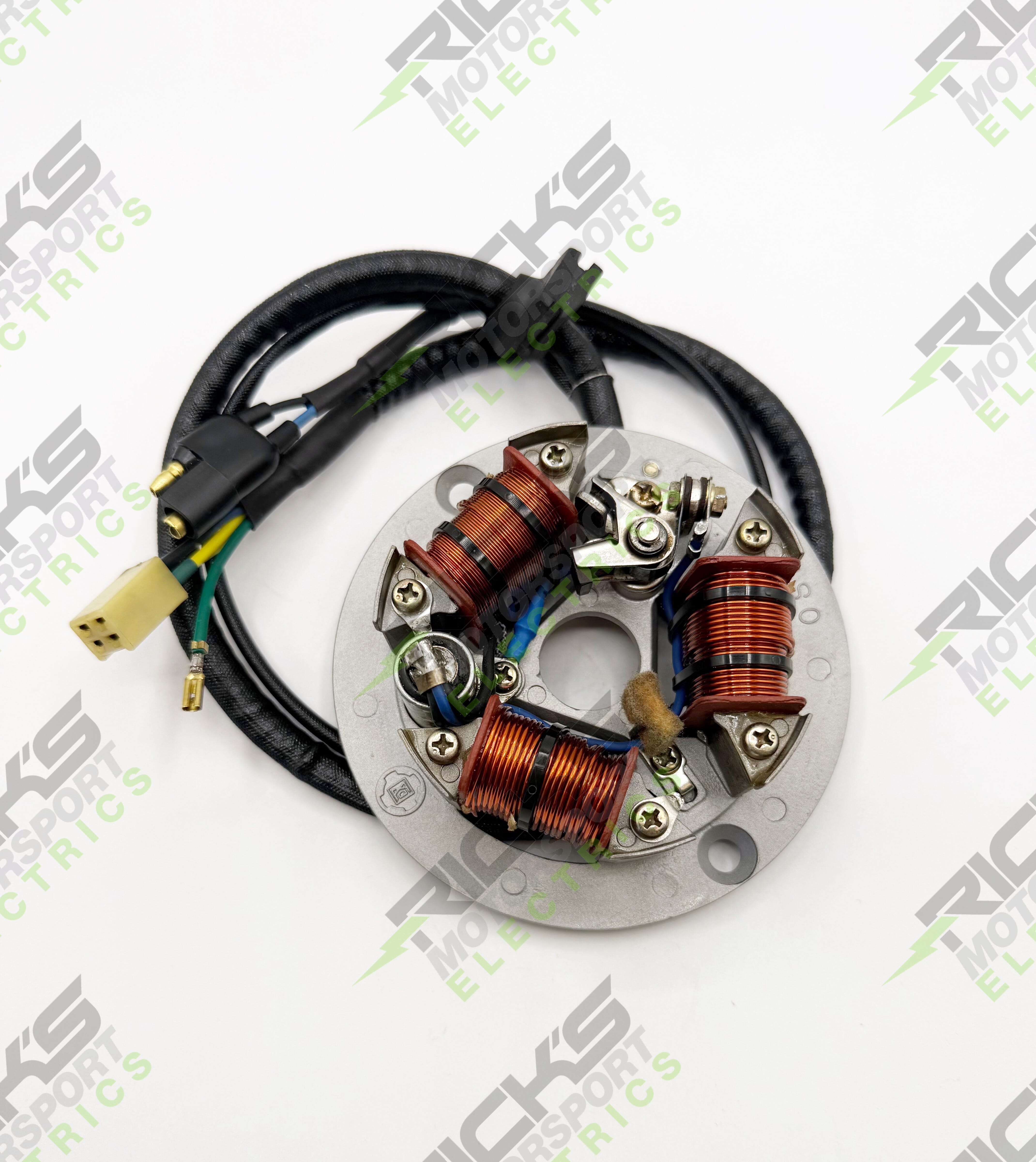 Rick's Motorsport Electrics offers a rebuild service for the Hodaka Wombat stator with OEM #943000. This service includes the repair of the exciter coil (OEM# 943009) and both lighting coils (lighting coil A OEM# 943013, lighting coil B OEM# 943014). *The Rebuild service does not include the points & condensor(s) but we can replace them if you supply the new parts.