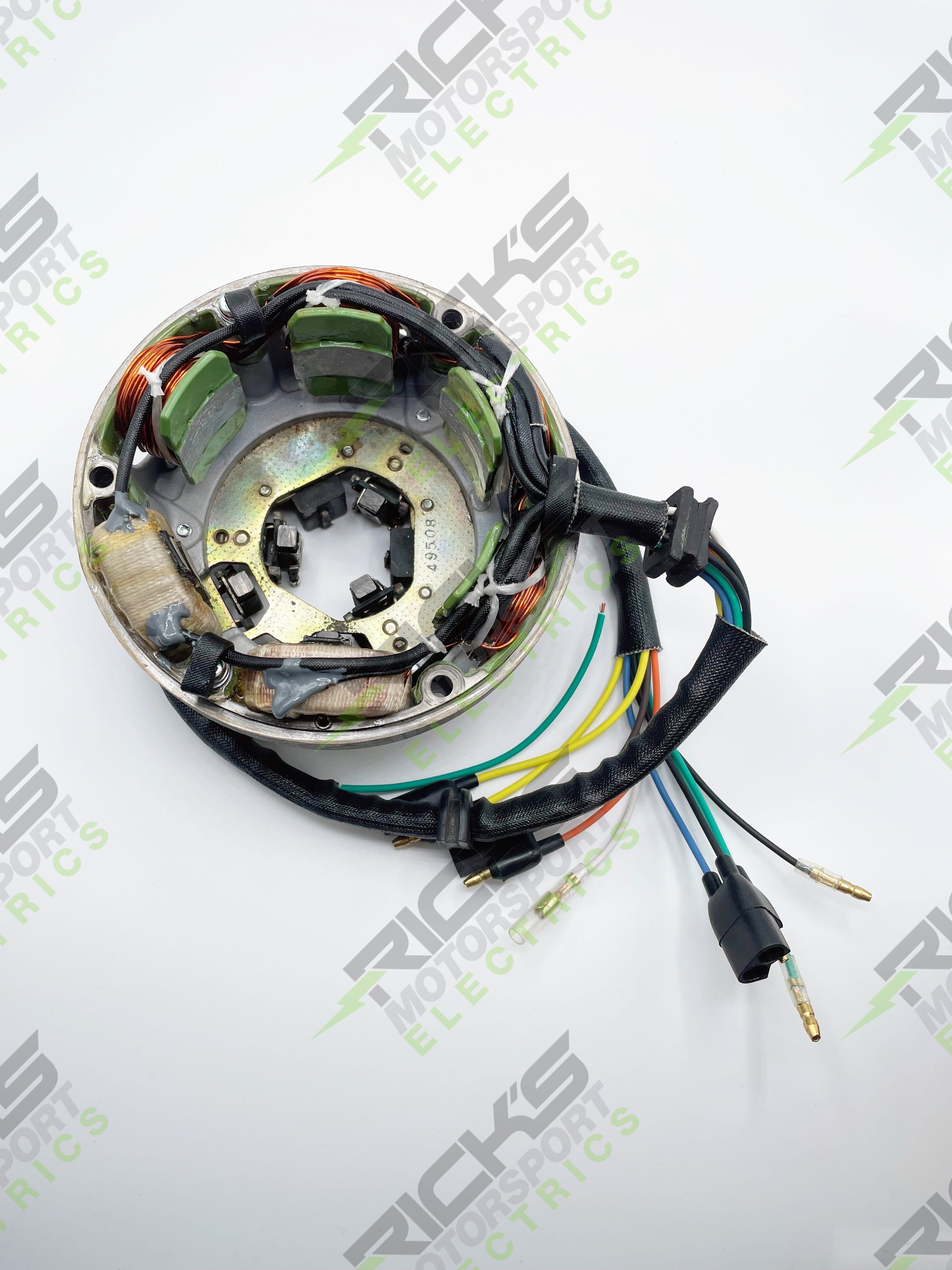 Rebuilt OEM Style Kawasaki Stator: This stator rebuild fits 1974-76 H1 and will include replacing all of the coils, a new harness, vapor blasting all of the housings and plates + all new hardware, terminals, and connectors. Please send stator mounted in housing, as shown in photos. We do not have the ability to rebuild the trigger coils at this time.