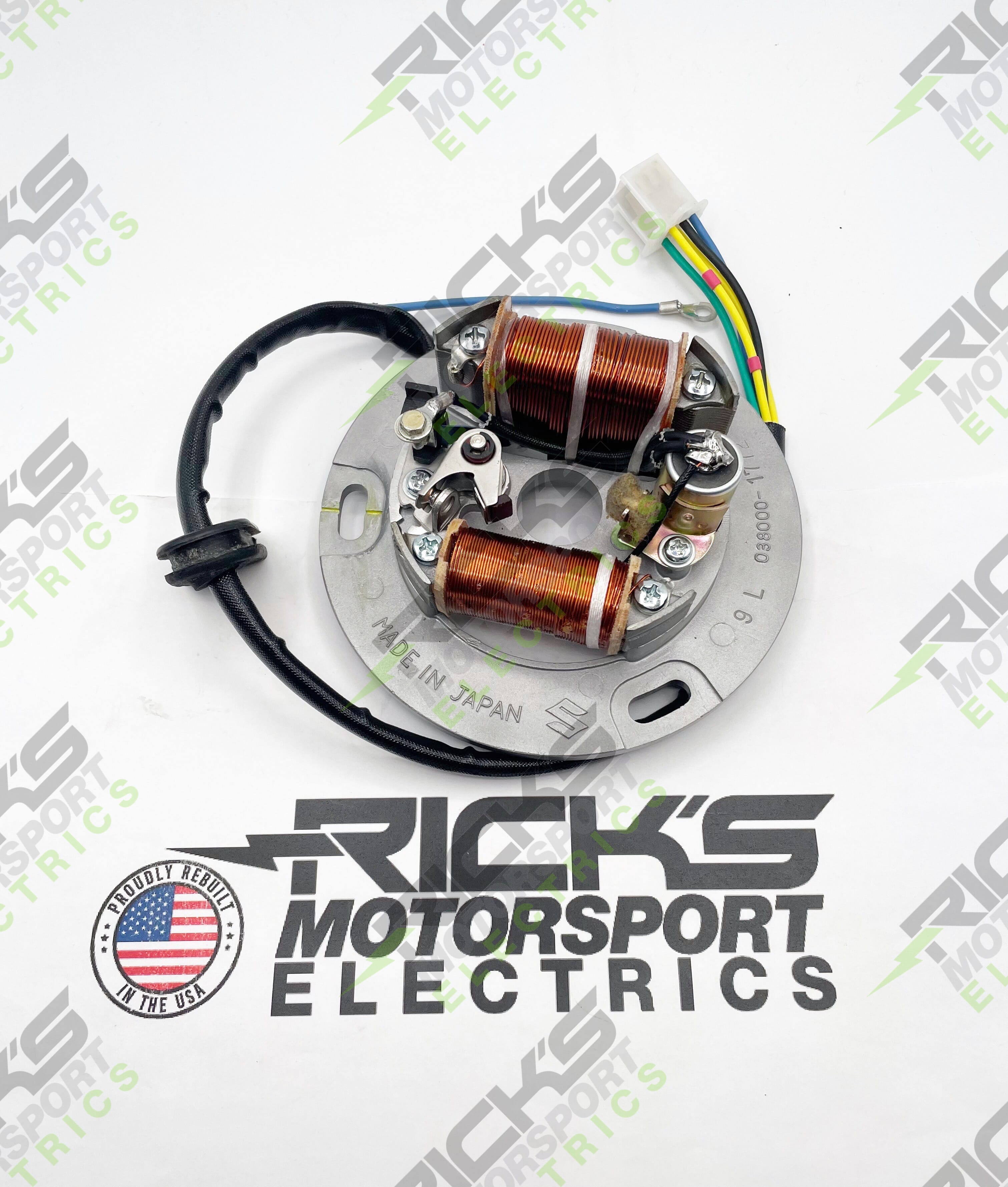 Rebuilt OEM Style Suzuki Stator: This rebuild service will fit 1972 Suzuki RV90 and replace OEM # 32100-27690. ***The rebuild does not include the points & condenser, but we can install new ones at no additional cost if you supply them.