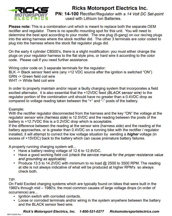 Rick's Motorsport Electrics offers a Brand New Aftermarket Rectifier-Regulator for your Vintage Honda Street Bike that is designed with the correct voltage set point to work with lithium ion batteries. Rick's part # 14-100 is a combination unit that will replace the separate rectifier & regulator in your system for OE#'s 31400-333-004, 31700-333-008, 31700-323-015, 31700-341-015, 31700-300-035, 31400-300-035. *Installation Instructions will be included - User's will need to designate a mounting spot for this rec-reg on their bike. **Please be sure to use our Year/Make/Model Part Search to ensure this product will work for your machine! ***This rec-reg is not for use with standard lead acid batteries. The voltage set point is 14V +/- .2. Please contact the manufacturer of your Lithium Ion Battery to ensure our product has the correct set point for their product. ***Rick's Motorsport Electrics One Year Product Warranty is for the Rec-Reg only. Rick's warranty does not cover batteries of any type. For additional hard parts - see our sister company https://oldschoolvintageparts.com/
