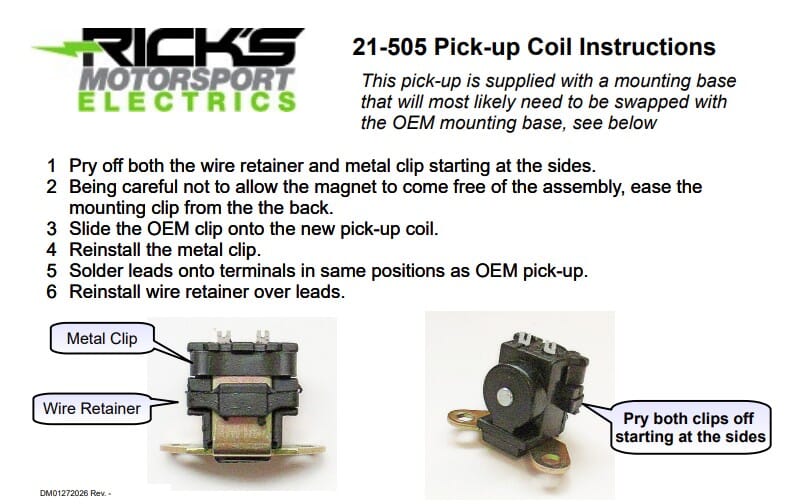 Trigger Coil (250 OHM): This piece comes off the stator leads and is enclosed in black plastic. *The wires are not included. This pick-up is supplied with a mounting base that will most likely need to be swapped with the OEM mounting base, see included instructions.