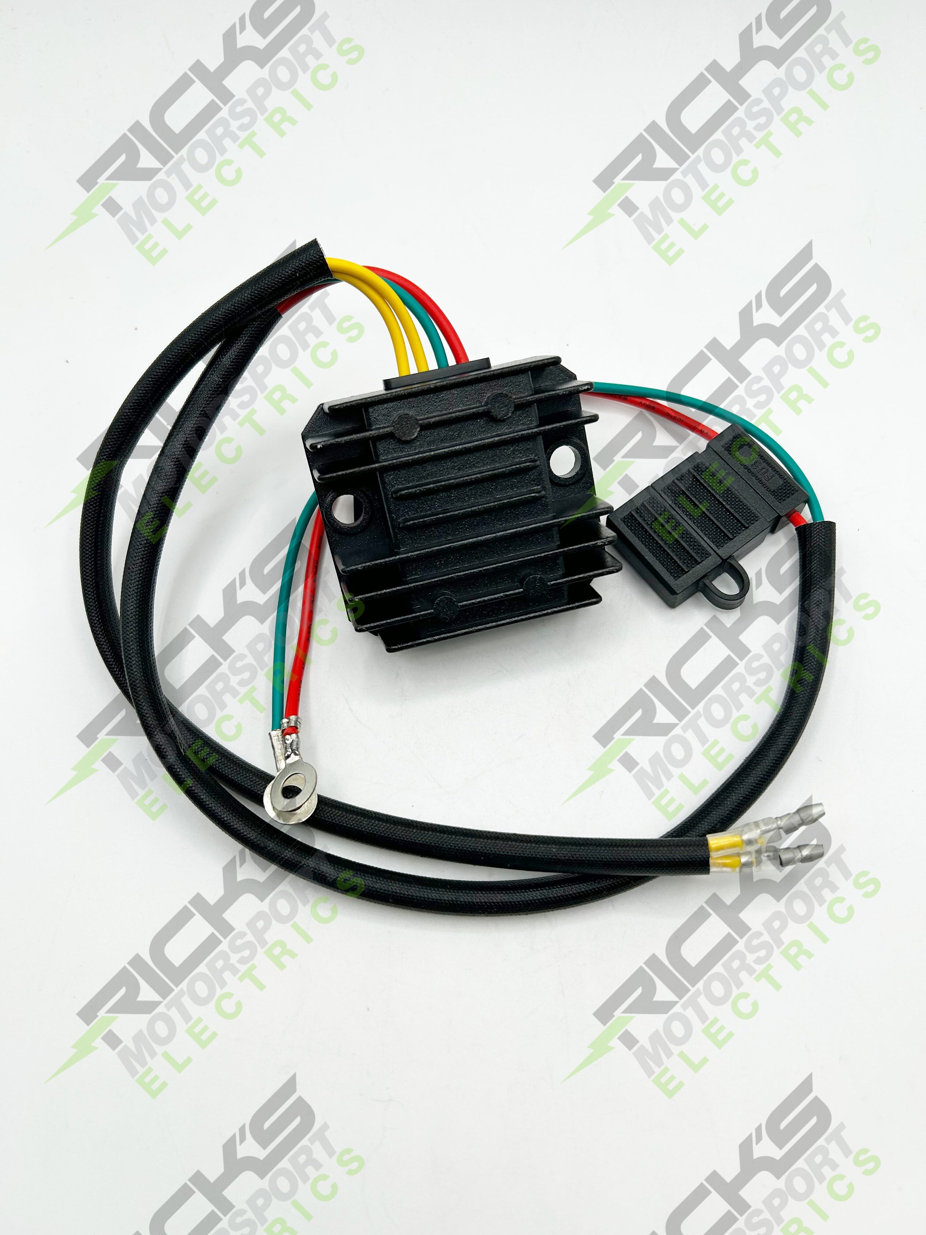 Universal Style Rectifier-Regulator; This is an aftermarket universal rec/reg that comes with bullet connectors & a 20 amp inline fuse. It is designed as a single phase, full wave unit for permanent magnet systems up to 20 amps. Customers will likely need to relocate this part as it may have different measurements than OE. Dimensions are: 2 1/2" x 2 1/4" x 1". This is for use with traditional lead acid batteries ONLY, it will NOT work with lithium batteries.