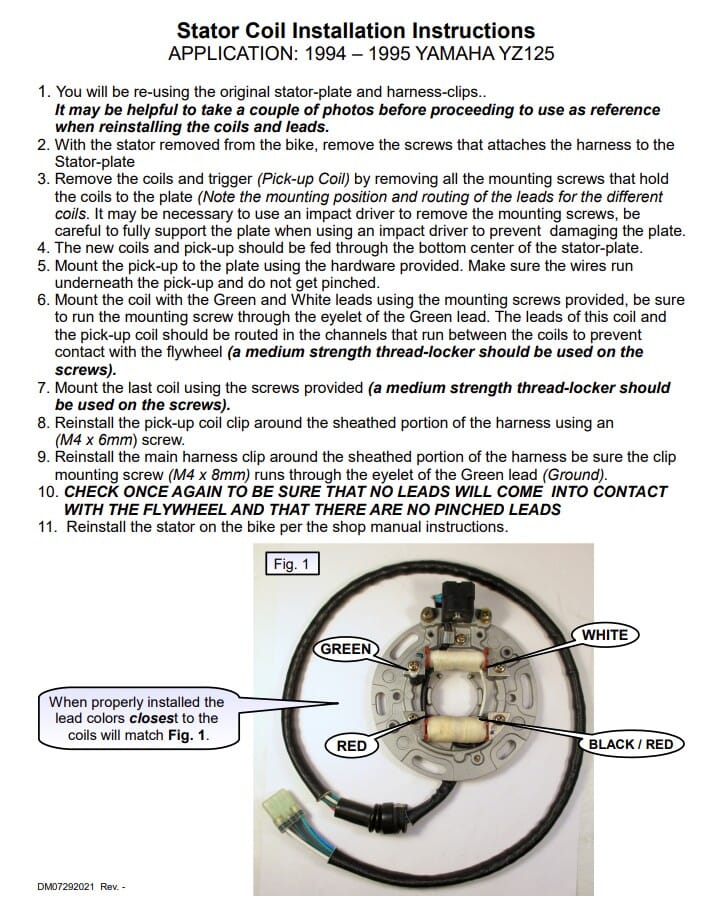 Yamaha Stator Rebuild Kit: Rick's Motorsport Electrics aftermarket stator rebuild kit contains brand new coils that will mount onto the existing OE stator plate, new trigger coil, new grommet, & new connector. Customers will need to re-use the OE stator plate. Installation instructions are included. Rick's Motorsport Electrics can mount & install the rebuild kit for an additional charge if you send your OE stator to us. These components will fit 1994-95 YZ125 dirt bikes and will replace OE # 4JY-85510-00-00.
